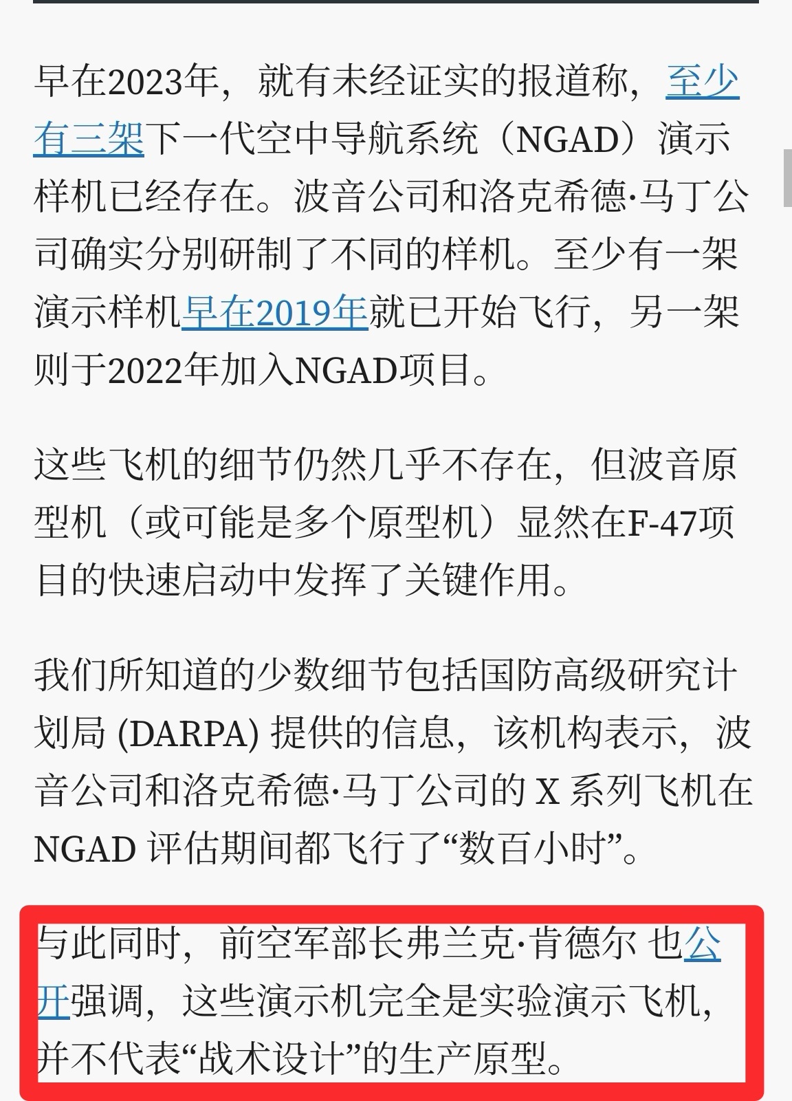 🔻TWZ咩美,这下MAGA战鹰要生气了。🔻前空军部长弗兰克·肯德尔也公开强调,这些演示机完全是实验演示飞机,并不代表“战术设计”的生产原型。🔻意思是今年3月宣布给波音开发F-47原型机之前,波音和洛马的所谓“技术验证机”和原型机的区别非常大,基本上只是验证一下一些子系统技术,外形和尺寸都估计和全尺寸原型机不怎么一样。🔻我们的原型机,可是已经弄出来好几架了,老美还要等28-29年才弄出来第一架,而且估计会拖延。