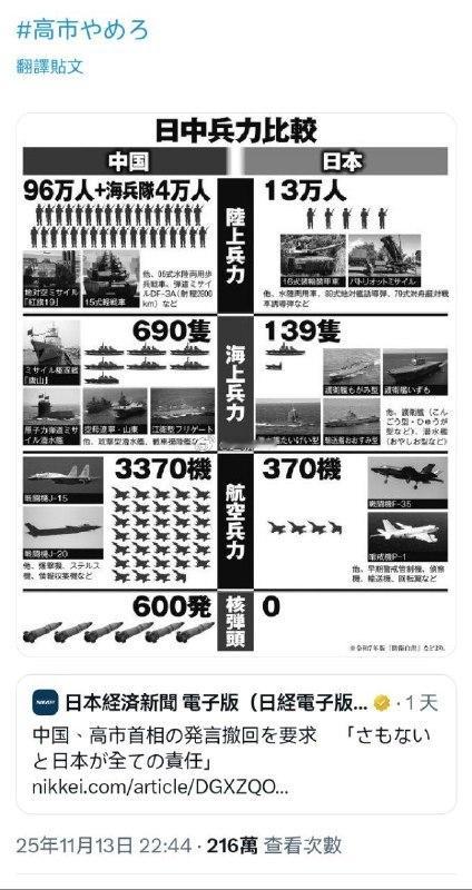 日本人上图做比较,中日两国兵力对比图。