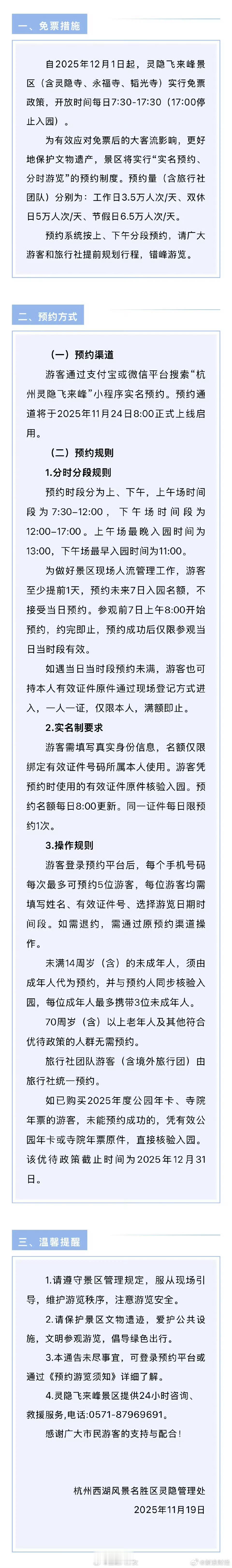 自2025年12月1日起,灵隐飞来峰景区(含灵隐寺、永福寺、韬光寺)实行免票政策,开放时间每日7:30-17:30(17:00停止入园)