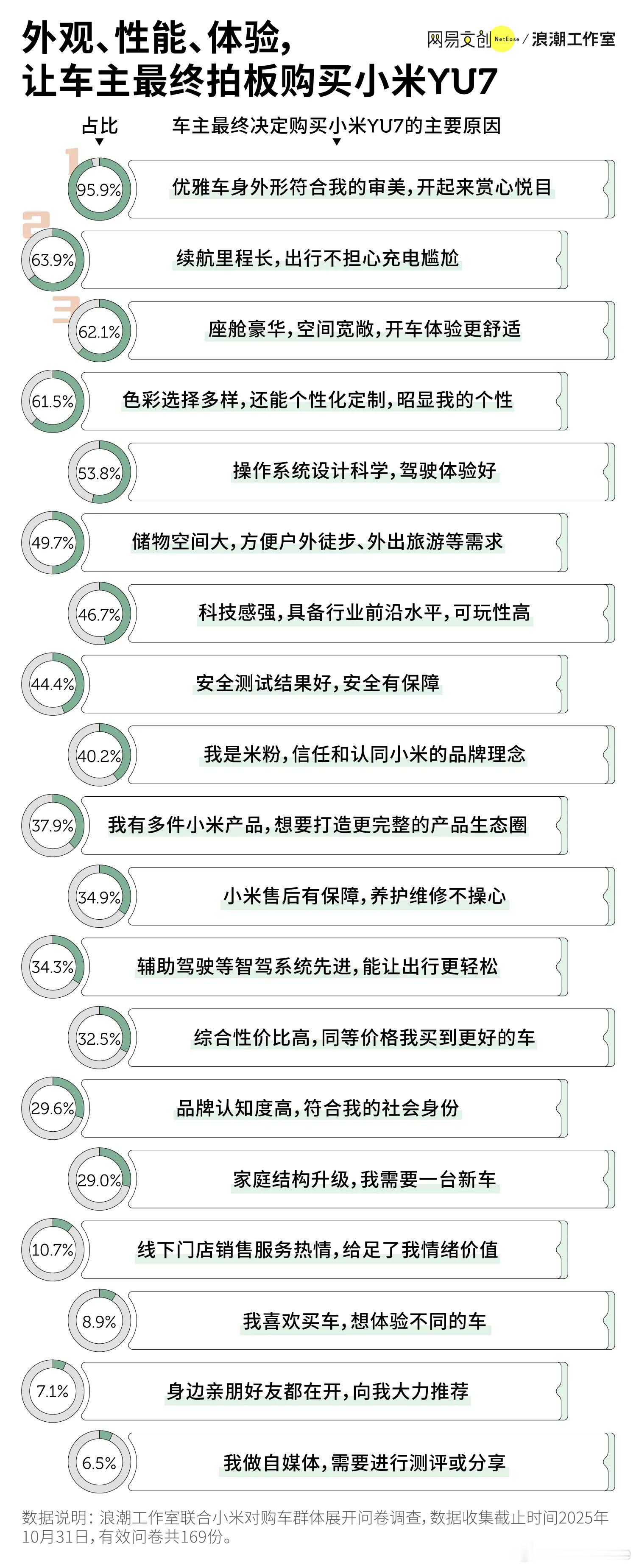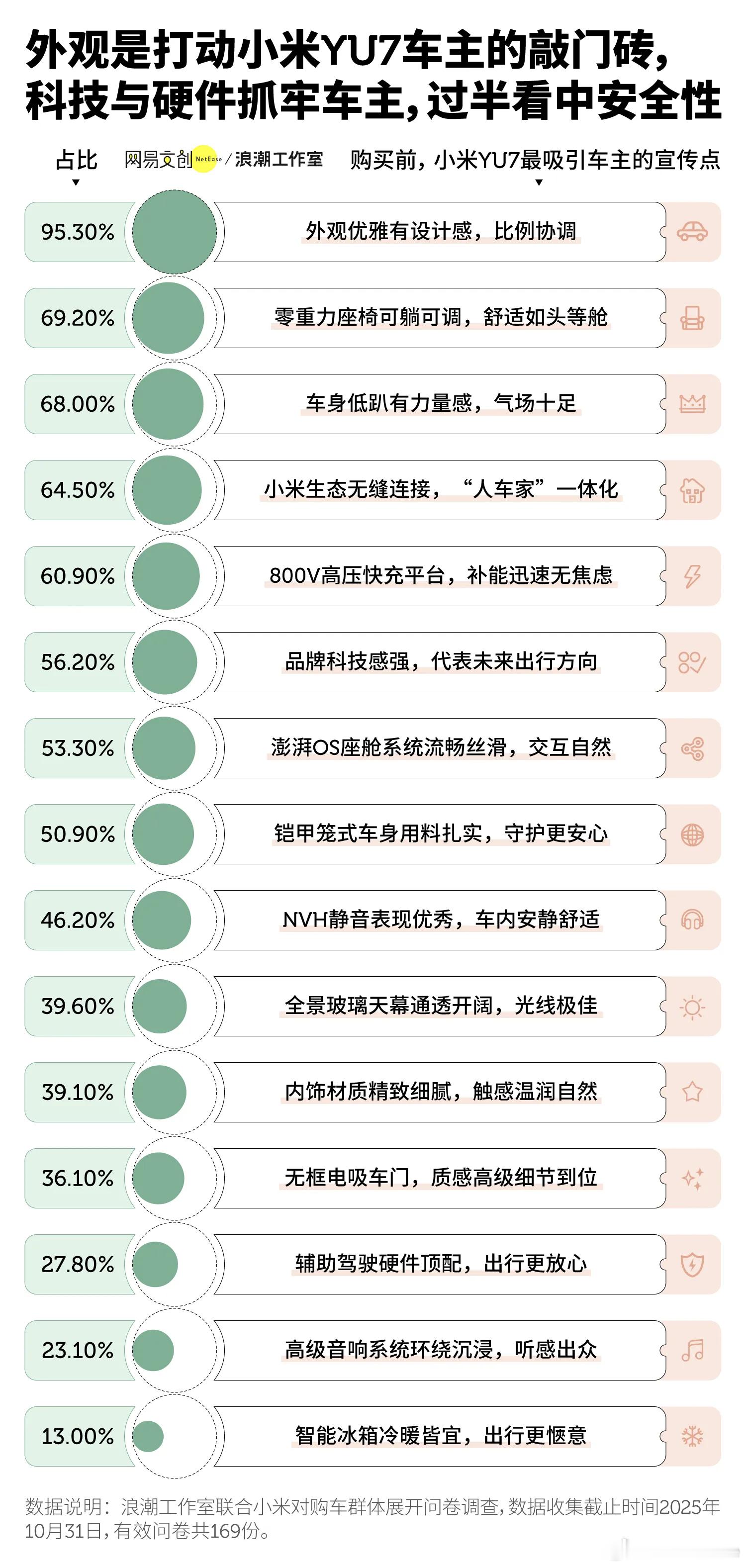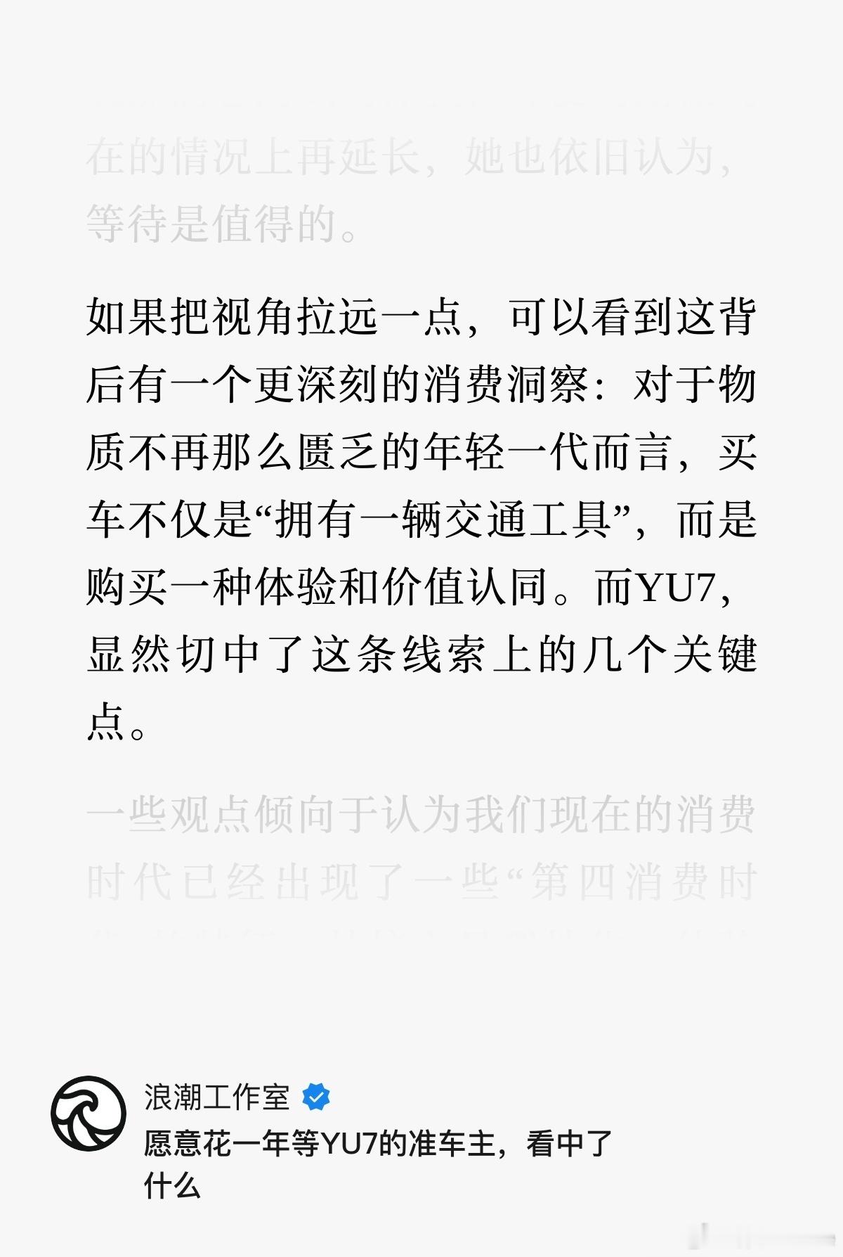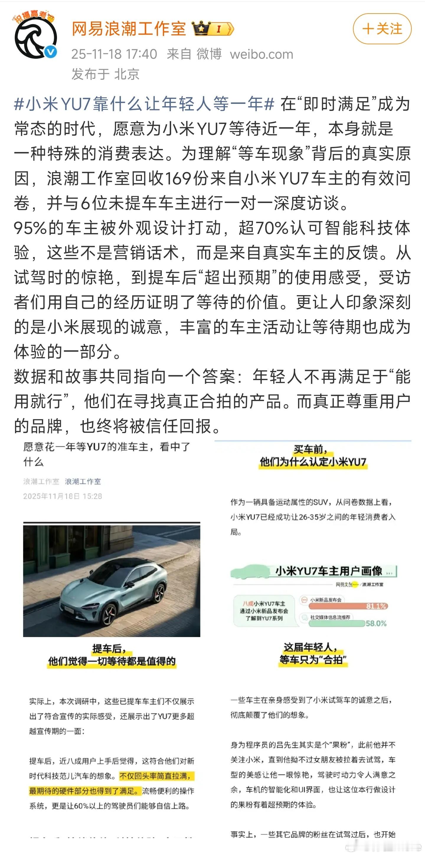 我虽然没有等一年,但也等了将近5个月。我选小米YU7的理由和网易浪潮工作室对车主们调研得到的理由大同小异。YU7外观非常帅,同级别里就没有比它好看的SUV;天际屏很有科技感,市面上暂时也只此一家;双零重力座椅解决双人出行短暂休息;还有就是安全。基本就是始于颜值,忠于产品。调研还有一个有意思的结论,八成左右的小米YU7车主是第1次购买电车,说明很多人只是因为小米出电车了才会考虑买电车。消费者愿意等,说明认同小米的产品,认同小米的文化。而小米主动为延期交付兜底购置税,又不定期赠送小礼品,这种负责任的态度,也能增加准车主们的等待信任。
