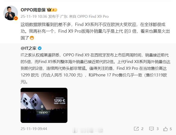 OPPO Find X9系列海外表现不错1、OPPO Find X9西班牙市场商用两周,销量几乎是OPPO Find X8的五倍;2、OPPO Find X9系列海外整体销量是上一代的2倍;3、OPPO Find X9 Pro海外销量是上一代的三倍。PS:OPPO Find X9 Pro欧洲市场售价1299欧元,约合人民币10700元,这几乎是与iPhone 17 Pro一致的。