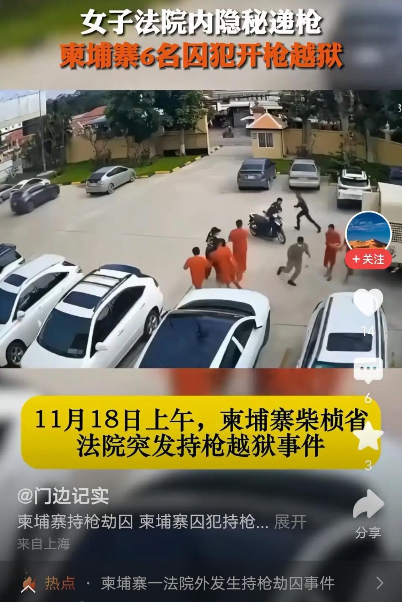 太颠覆认知了! 柬埔寨法院门口惊现硬核劫囚,美女外表的弱女子藏枪潜伏,趁囚犯下车瞬间递枪,同伙接枪就朝警员开火, 全程不到一分钟就趁乱逃窜,这哪是现实,简直比电影还疯狂! 别光盯着“美女劫囚”的噱头,这事儿根本不是“为爱疯狂”那么简单。 6名逃犯都是越南籍,明显是有预谋的团伙作案,能在司法重地公然挑衅,暴露的是当地安保的巨大漏洞。