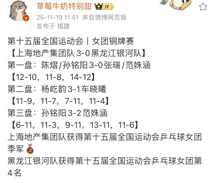 11.19日,全运会现场实况,王励勤主席来到现场观赛。 今天的全运会乒乓球项目只有两场比赛, 上午10点的女团铜牌赛, 上海队vs黑龙江队 其中黑龙江队的王曼昱因为颈部不适,昨天下午已经回到北京治疗, 黑龙江队今天和上海队的比赛,也是尽力而为, 最终的结果就是上海队3-0黑龙江队。 上海获得季军,黑龙江队获得第四名。 其实每个队伍的目标不同,黑龙江队团队进入前四,从黑龙江体育局发出的通知中可以看到, 杀入四强,是比较满意的成绩。 这是上午的一段比赛视频,大家都很享受比赛, 打得比较轻松, 两支队伍也没有进入决胜盘。 今天上午现场的情况, 现场观众比较少,基本都是空座位, 也很安静。 有人说就喜欢这样的环境,不吵, 有利有弊吧, 这就是多年前乒乓球比赛的实况, 收入很少,赞助也很少,自然运动员教练员的保障,训练场地,技战术研究等都会受到影响, 但确实现场很安静, 观众多的话,大家的消费直接带动城市周边的收入, 并且会带来很多人气,对于城市的旅游等民生产业都有好处, 赛事本身的收入也会直线上升。 在现场看到了王励勤主席和秦指导, 在认真的看比赛。 上海队获胜,也是一大喜事。 晚上18点, 即将进行的是女团决赛,河北队vs山东队, 夺冠最热门的辽宁队和江苏队,在半决赛的时候被河北队和黑龙江队淘汰, 下半区的实力都差不多,最后山东队进入决赛。 期待决赛的精彩。