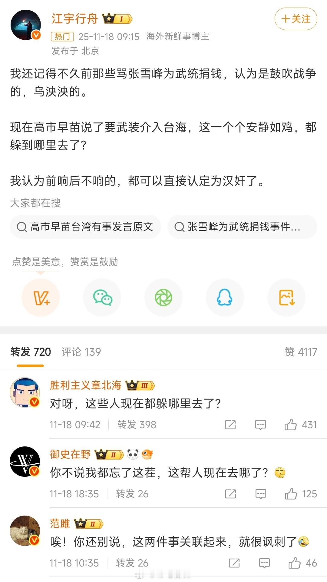 对哦,那些骂张雪峰鼓吹战争的人呢,高市早苗也骂一下呗,不会不敢吧