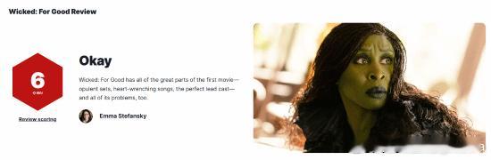 《魔法坏女巫2》IGN 6分奇幻歌舞片《魔法坏女巫2》将于11月20日在中国香港上映,11月21日在北美上映。目前《魔法坏女巫2》媒体评分已全面解禁,IGN给出了6分,认为本作继承了第一部电影的所有优点——华丽的布景、感人的歌曲、完美的主演阵容——但同时也包含了第一部电影的所有缺点。总评:《魔法坏女巫2》为朱浩伟执导的这部歌舞电影系列画上了句号,而结局却黑暗至极。骇人的动作场面、令人黯然神伤的音乐桥段、以及过度昏暗的布景光影,使这部续集既延续了前作的所有缺陷,还引入了一些新的问题。两位主演辛西娅·艾莉沃和爱莉安娜·格兰德依旧光彩照人,同框时火花四溅,但观众却不得不忍受冗长的剧情才能看到她们的精彩表现。值得一提的是,《魔法坏女巫》首作IGN给了9分的高分,认为该作在尊重原著的基础上,将百老汇最受欢迎的音乐剧之一搬上了银幕。