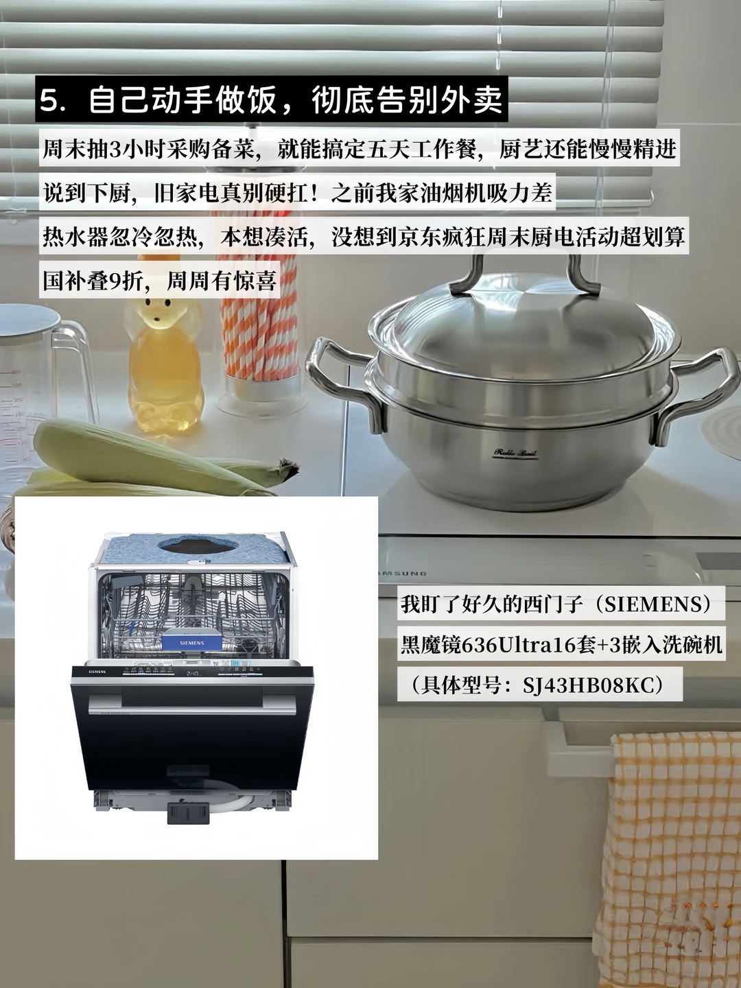 周末抽3小时采购备菜,就能搞定五天工作餐,厨艺还能慢慢精进。说到下厨,旧家电真别硬扛!之前我家油烟机吸力差、热水器忽冷忽热,本想凑活,没想到京东疯狂周末厨电活动超划算——国补叠9折,周周有惊喜!我盯了好久的西门子(SIEMENS)黑魔镜636Ultra16套+3嵌入洗碗机(具体型号:SJ43HB08KC)也有优惠!它还通过了联合厨卫研究所用百根试管测油污等多种测试,微米蒸汽洗能轻松搞定爆炒后的顽固油垢,还有双核热动力烘干+五星级消杀,洗完直接存着都放心;顺带看的一级静音燃气热水器,能率(NORITZ)【慧心·静界PRO】16升燃气热水器(具体型号:16EQ42AFEX),自适应恒温不折腾,阴离子抑菌还护皮肤。打开京东APP搜“厨电666”就能直达会场,专业严选的好物+全网低价,省钱过日子也能提升质感。