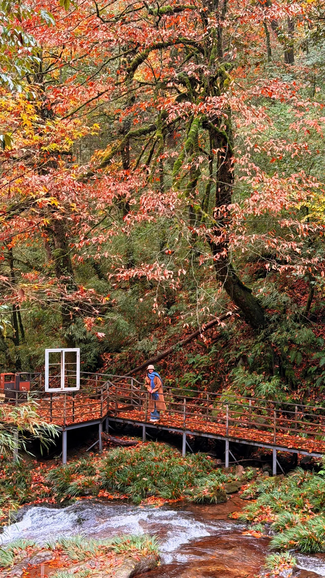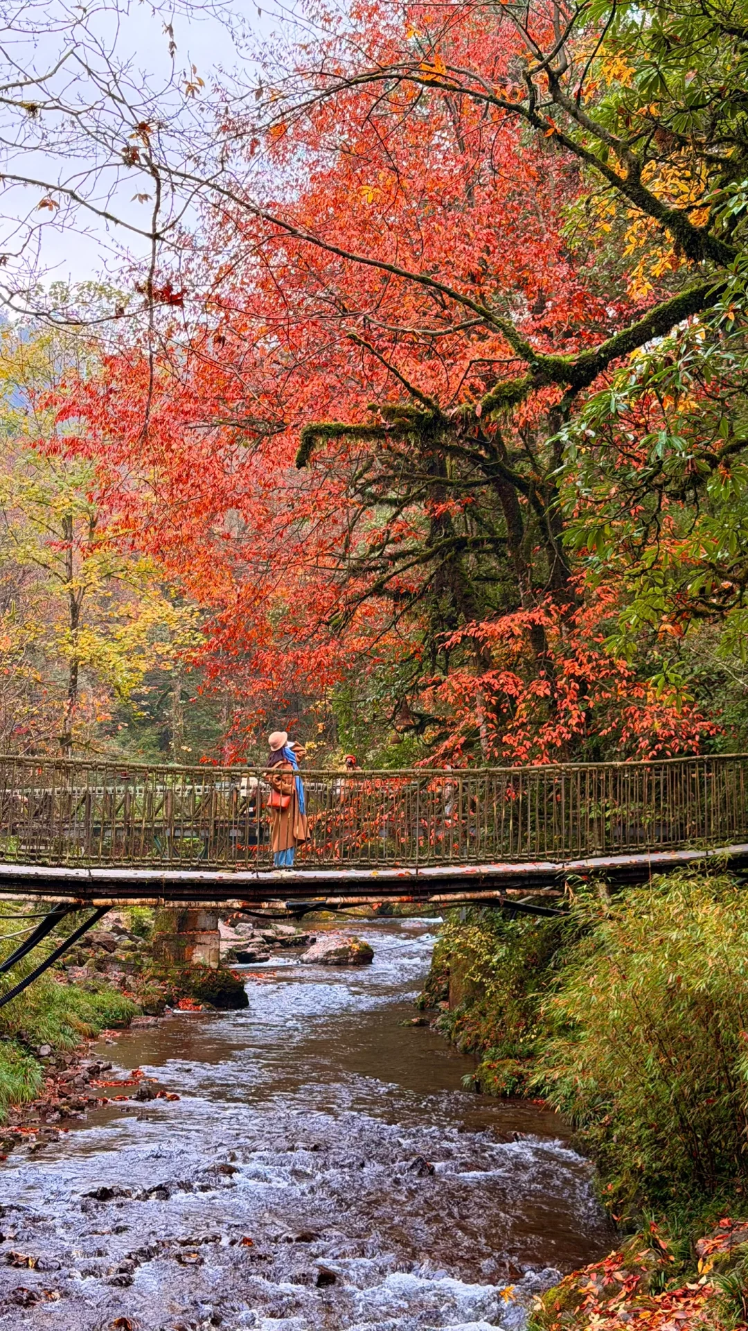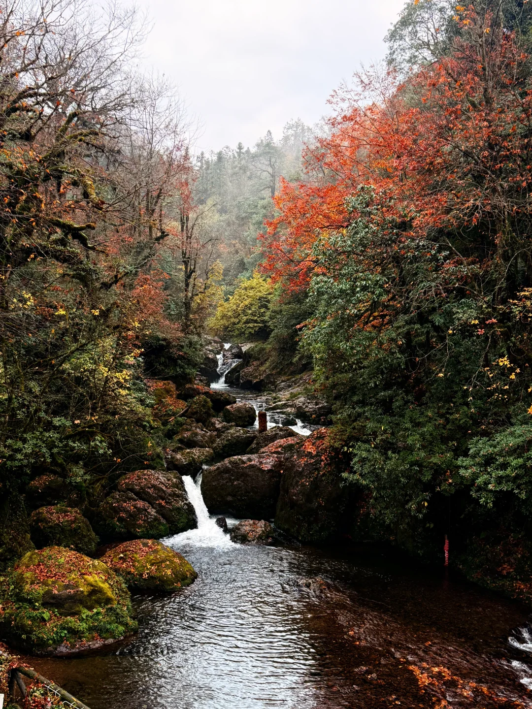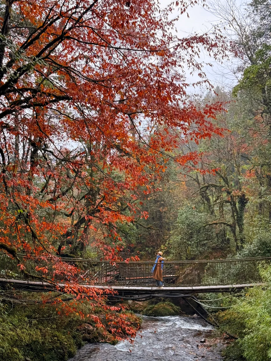 一路上可以看见潺潺流动的溪水、瀑布、红叶