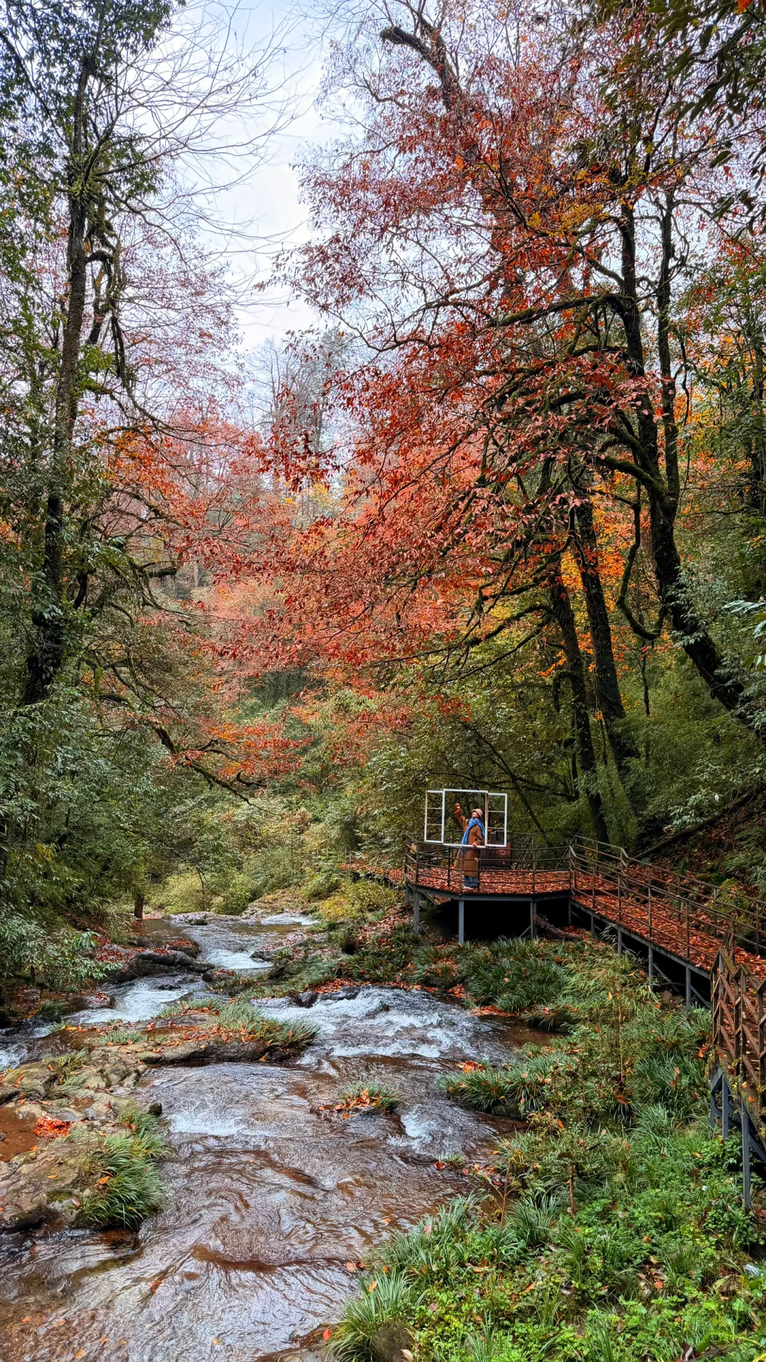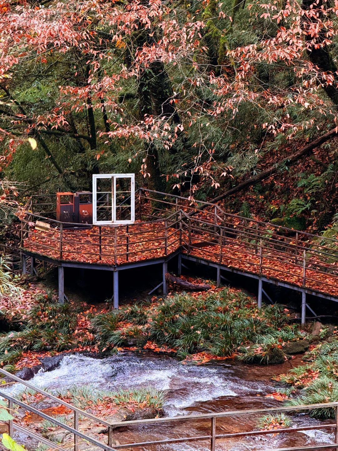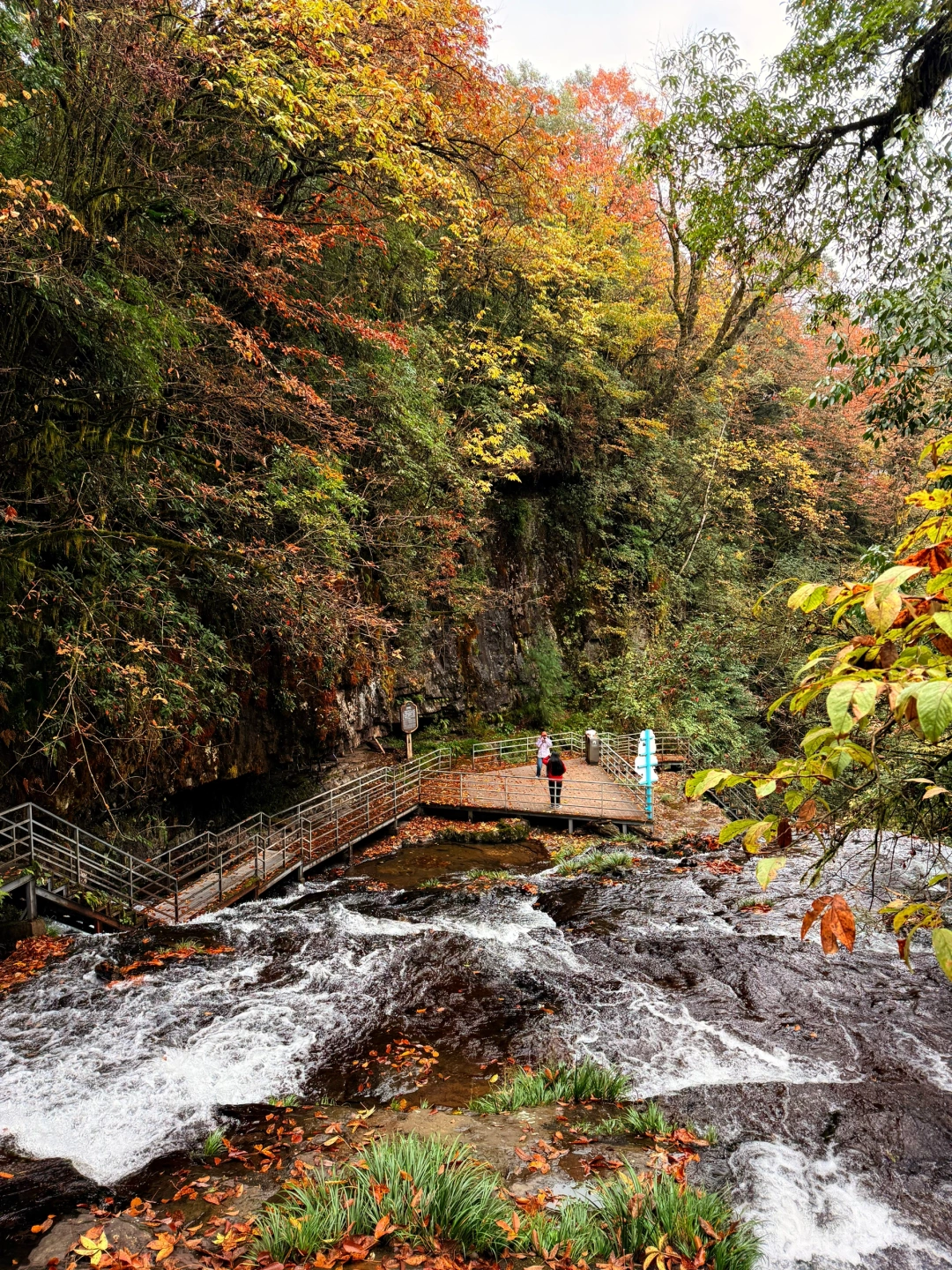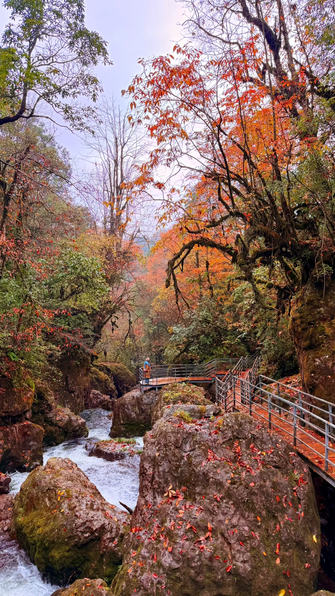一路上可以看见潺潺流动的溪水、瀑布、红叶