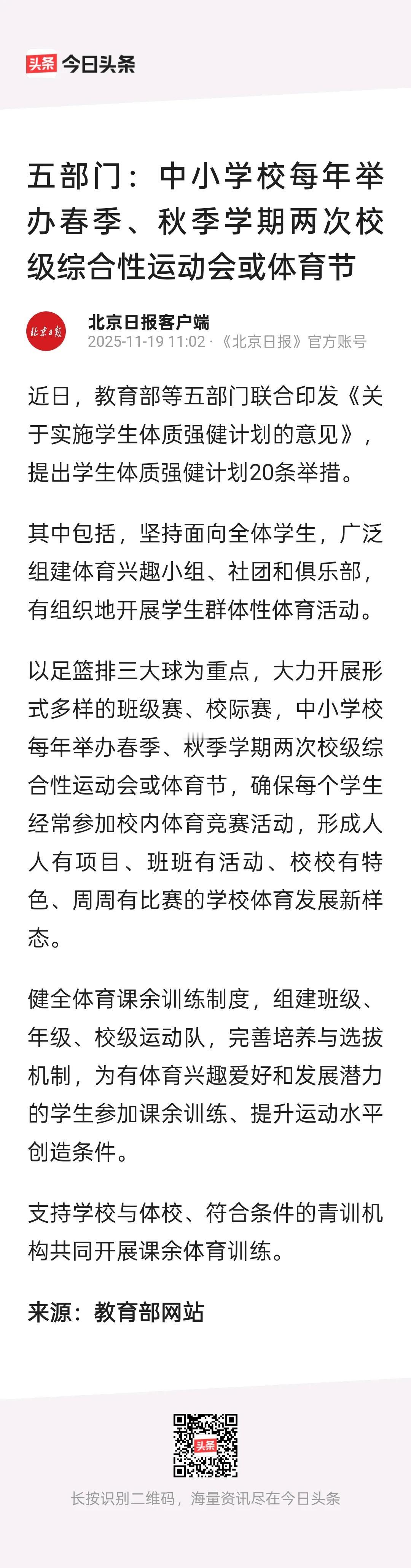 体育老师来活了!国家喊学校每年组织两次运动会。 现在的体育老师跟以前可不一样了,以前的体育老师经常生病,经常见不着人 有好多体育老师为了晋职称,放弃了自己喜欢的体育学科而改教别的学科,以至于很多人调侃自己的数学是体育老师教的 但是现在不一样了,最新教育部又刚发了文件,要求学校里边要多多的组织体育运动,每个学生每天在校内不少于两个小时的体育运动,让学生身上有汗,眼中有光。 除此之外,还要每学年组织两次运动会 要组织运动会,体育老师肯定要挑起大梁 说实话,今天的校园内孩子们每天的生活确实很单调,就是不断的上课上课上课,每个老师都还轮番给孩子们上课,让孩子们背东西,计算题,做实验 虽然现在还是以高考看分数为主,但是体育运动已经刻不容缓。 这每年两次的运动会,会给学生带来想要意见的好处 会让孩子对学校有新的好奇,会让学生对学校有新的期待,也会融洽同班同学之间的关系,增强集体荣誉感。 同时也挖掘出一些体育特长生,可能就在不经意间改变学生的一生 体育老师,你的好日子来了!