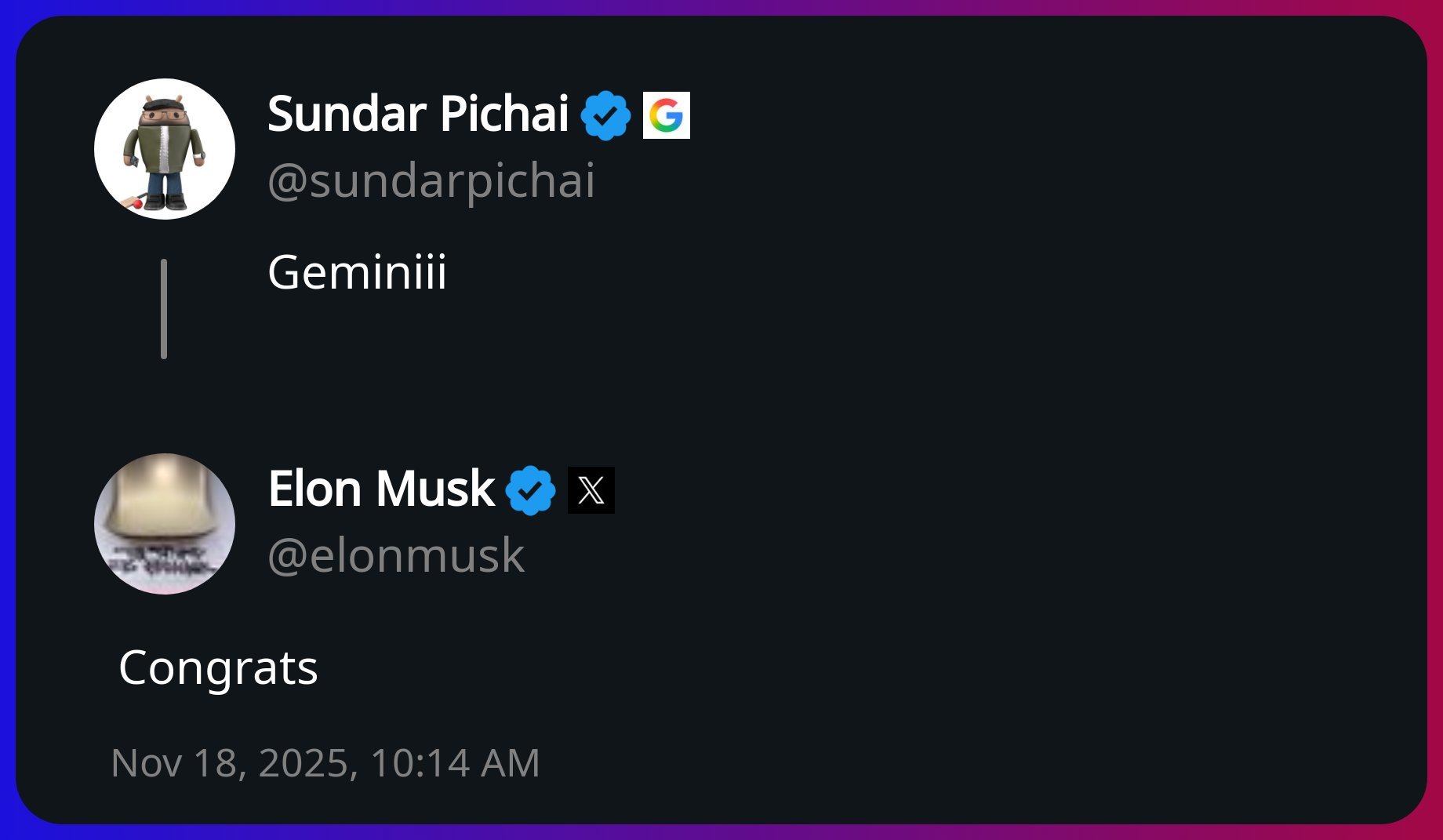 山姆奥特曼和马斯克同时恭喜Gemini 3,今年的最强模型大概率被谷歌摘走了?
