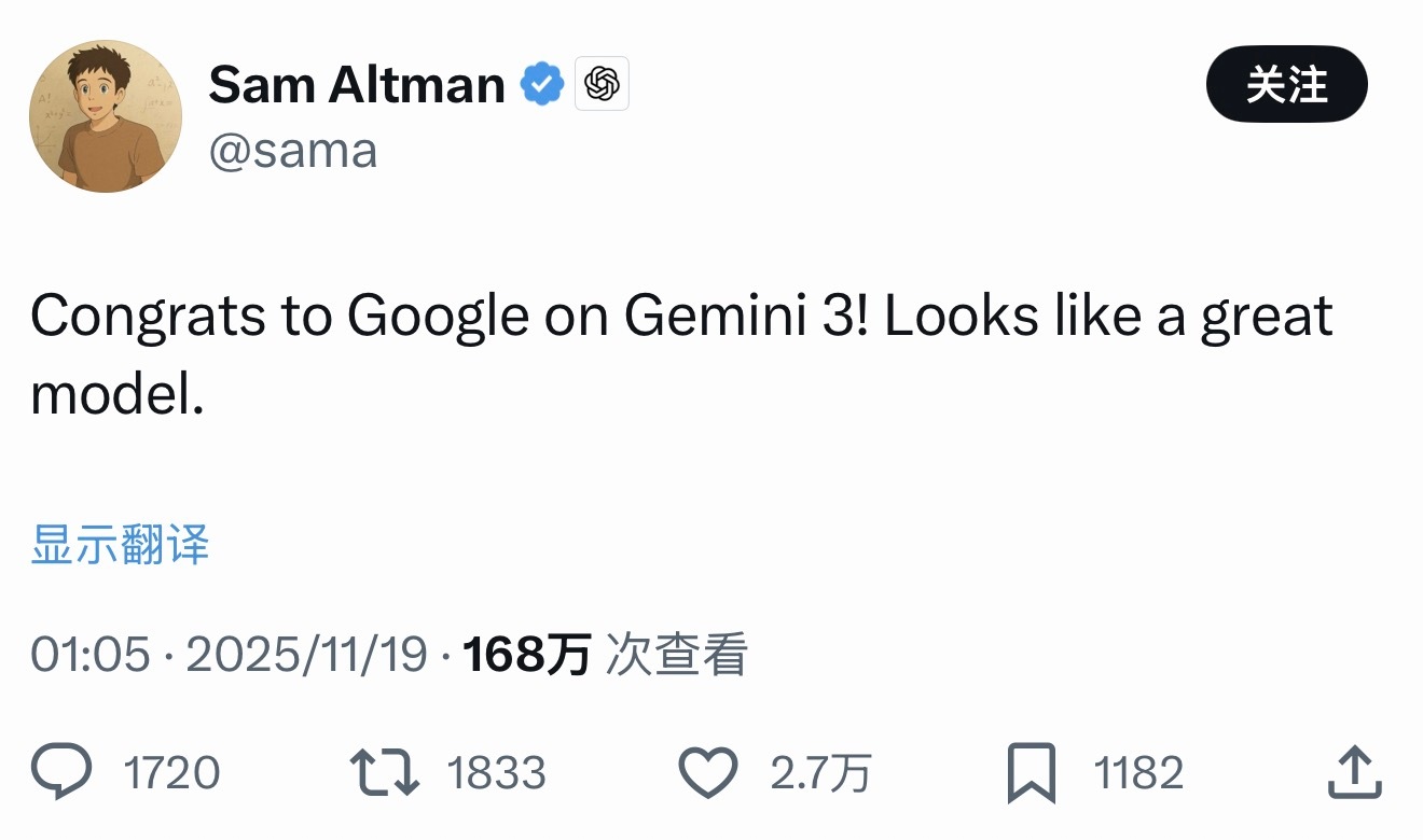山姆奥特曼和马斯克同时恭喜Gemini3,今年的最强模型大概率被谷歌摘走了?