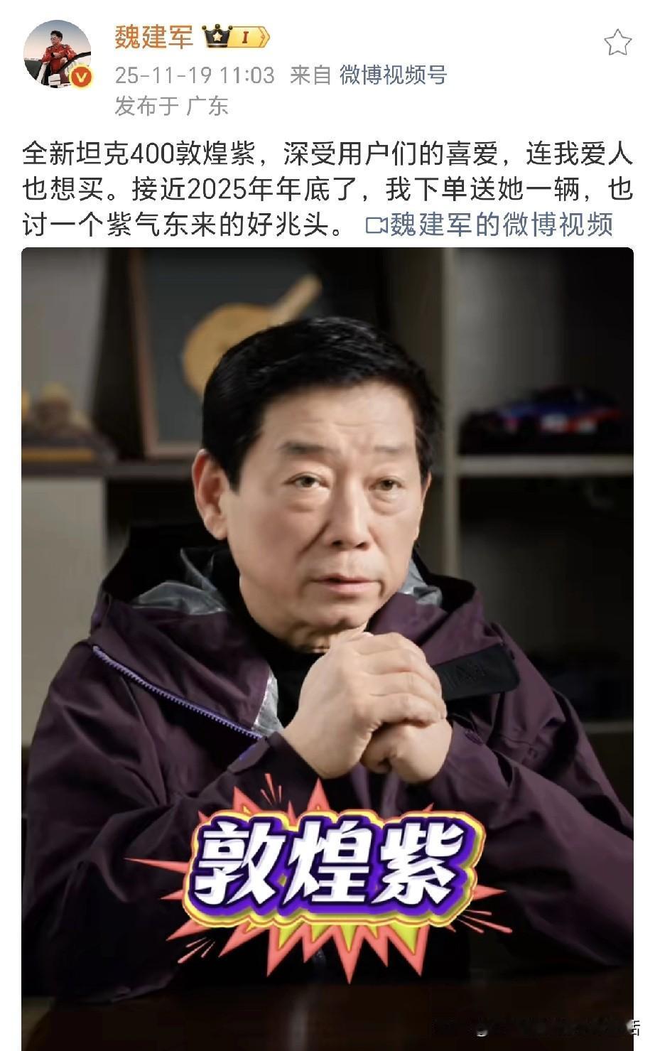 魏建军:全新坦克400,订单非常火爆,全新坦克400敦煌紫,连我爱人也想买。 长城汽车魏总表示全新坦克400敦煌紫,深受用户们的喜爱,连我爱人也想买。我下单送她一辆,也讨一个紫气东来的好兆头。也是作为2026年的新年礼物! 今年是长城汽车的35周年,坦克品牌已累计销量超过70万辆!中国越野SUV销量第一品牌,坦克当之无愧! 今年全新坦克500敦煌绿和全新的坦克400敦煌紫色,都非常受欢迎!2025广州国际车展还有两天就要开始了,长城汽车在琶洲会展中心A区4.1号馆,有没有一起的?找个搭子,一起去广州车展感受长城坦克汽车铁汉柔情的魅力!