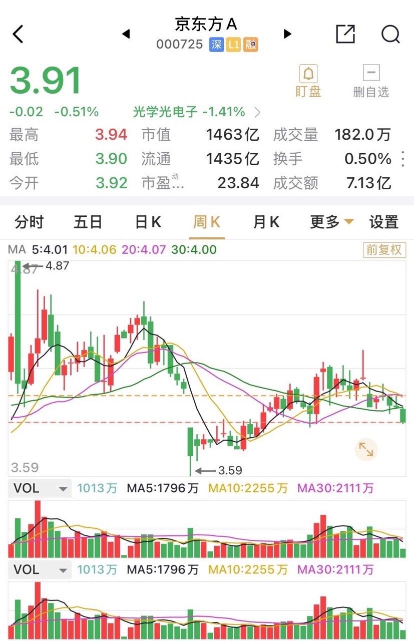 京东方本轮或将向下至3.7-3.8元的区间。早盘收3.91元,看来3.9元的关口亦难保全,涨难跌急目前是京东方个股的股性,从高点4.34元向下已经有10%的跌幅,在月线上显示三连跌,与之前的三连涨正好相距,估计真正企稳转红需等12月K线来修正。当然对于京东方3.7-3.8元的空间,下跌空间有限,但京东方市净率仍在1.0倍上方,股价下行的极限位置或将考验此位置。