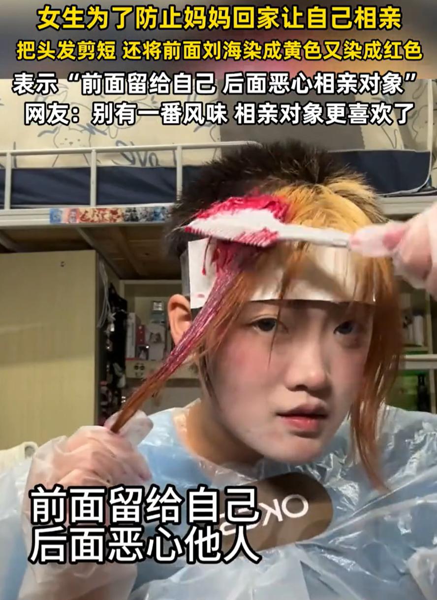 安徽有个姑娘总被老妈催婚,实在受不了就剪了寸头,把刘海染成红黄色。她说这样相亲对象看了就跑,老妈再没法逼她。 网友看图说其实不用这么折腾,还有人开玩笑万一对方喜欢这发型呢。但大家后来讨论发现,现在年轻人结婚想法不同了,想慢慢找对的人,不像上一辈着急找人配对。 老妈也是担心孩子以后一个人过不好,可硬逼着反而让两边都闹心。姑娘现在头发剪了,到底能不能躲过相亲还说不清,但这事在网上吵了好几天。 事情到这儿了,往后发展谁也不知道。