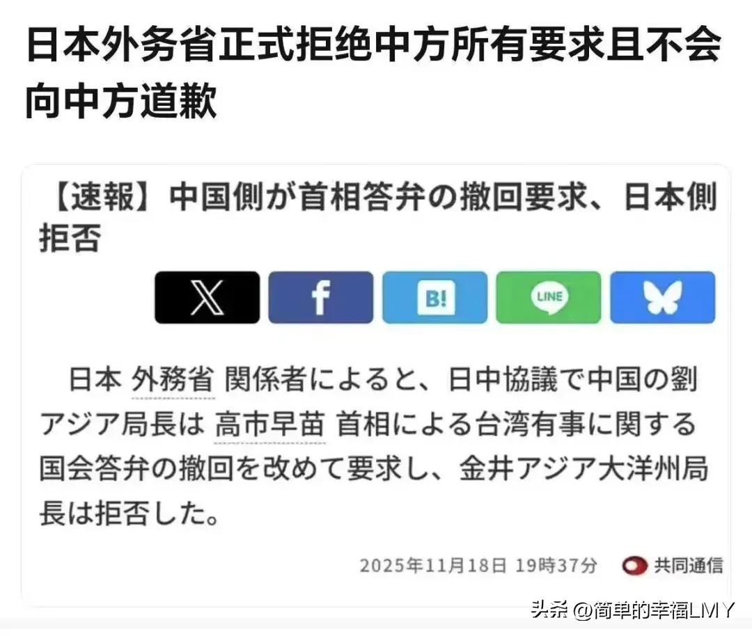 如此甚好,日媒:日本外务省正式拒绝中方所有要求,且不会向中方道歉。 日本外务省这一强硬表态彻底撕下了日本政府长期以来的伪装,让所谓“坚定支持一个中国”的承诺沦为经不起推敲的空话。 台海问题从来都是中国的核心利益所在,是碰不得的红线、越不得的雷池,这一点在国际社会早有共识,日本政府此前也多次在公开场合作出相关承诺。 如今高市早苗公然抛出“出兵台海”的危险言论,日本外务省非但不加以纠正,反而用“拒绝所有要求”的姿态火上浇油,这样的操作怎能不让人怀疑其过往立场的真实性? 所谓的“一个中国”原则,在日本政客的利益算计中,难道只是随时可以背弃的口头支票?要知道,台湾是中国领土不可分割的一部分,这是历史定论、法理事实,更是国际社会普遍遵循的国际关系基本准则。 任何企图分裂自己国家的行为,都会遭到全体中华儿女的坚决反对,任何外部势力妄图干涉中国内政、插手台海事务的图谋,都注定会以失败告终。 日本作为二战战败国,本应深刻铭记历史教训,恪守和平宪法,在涉及他国核心利益的问题上保持克制与敬畏。可如今高市早苗的言论,以及日本外务省的强硬回应,无不暴露其野心不死的真实面目,这与当年军国主义的扩张思维何其相似? 日本政府此次的强硬,看似是“硬刚到底”的姿态,实则是对自身实力的误判,更是对中国维护国家主权和领土完整决心的低估。近年来,日本不断突破和平宪法限制,扩充军备、与他国缔结军事同盟,其军事扩张的野心昭然若揭。 而台海问题,不过是其实现地区霸权野心的一个跳板。他们以为靠着几句挑衅言论、一番强硬表态就能吓倒中国,却忘了中国早已不是百年前那个任人欺凌的国家。如今的中国,综合国力日益强盛,国防力量足以震慑任何来犯之敌,维护国家领土完整的决心坚如磐石,岂容他人指手画脚? 高市早苗扬言日本自卫队要在台海行使集体自卫权,日本外务省更是用拒绝道歉的行为为其背书。既然话说得如此决绝,难道不该说到做到?中国向来不惹事,但也绝不怕事。 对于任何敢于挑战底线、侵犯核心利益的行为,我们早已做好了充分准备。所谓的“集体自卫权”,在绝对的实力差距和正义的立场面前,不过是自欺欺人的把戏。真要走到兵戎相见的地步,日本有多少底气能承受后果? 当年的历史已经给出了答案,如今再想重蹈覆辙,无异于以卵击石、自寻死路。日本政府的这一决策,无疑是将中日关系推向了危险的边缘。中日一衣带水,两国在经济、文化等多个领域有着广泛的合作,保持友好关系符合两国人民的根本利益。 可日本政客为了一己私利,不惜牺牲两国关系大局,在台海问题上铤而走险,这种短视行为终将反噬自身。近年来,中日贸易往来密切,中国市场为日本企业提供了广阔的发展空间,一旦关系破裂,日本经济必将遭受重创。 更重要的是,违背历史潮流、破坏地区和平稳定的行为,也会让日本在国际社会陷入孤立。所谓“多行不义必自毙”,日本外务省的强硬表态或许能逞一时之快,但终究改变不了历史大势。 中方维护国家主权和领土完整的决心和能力不容置疑,任何分裂国家的企图都注定会被粉碎。日本政府若执迷不悟,继续在台海问题上玩火,必将付出沉重的代价。时代不同了,中国早已今非昔比。 我们始终坚持和平发展,但也绝不放弃使用武力捍卫国家核心利益。日本该清醒了,放弃不切实际的幻想,停止挑衅行为,回到恪守一个中国原则、尊重中国核心利益的正确轨道上来。否则,等待它的只会是搬起石头砸自己的脚,在历史的洪流中被彻底淘汰。
