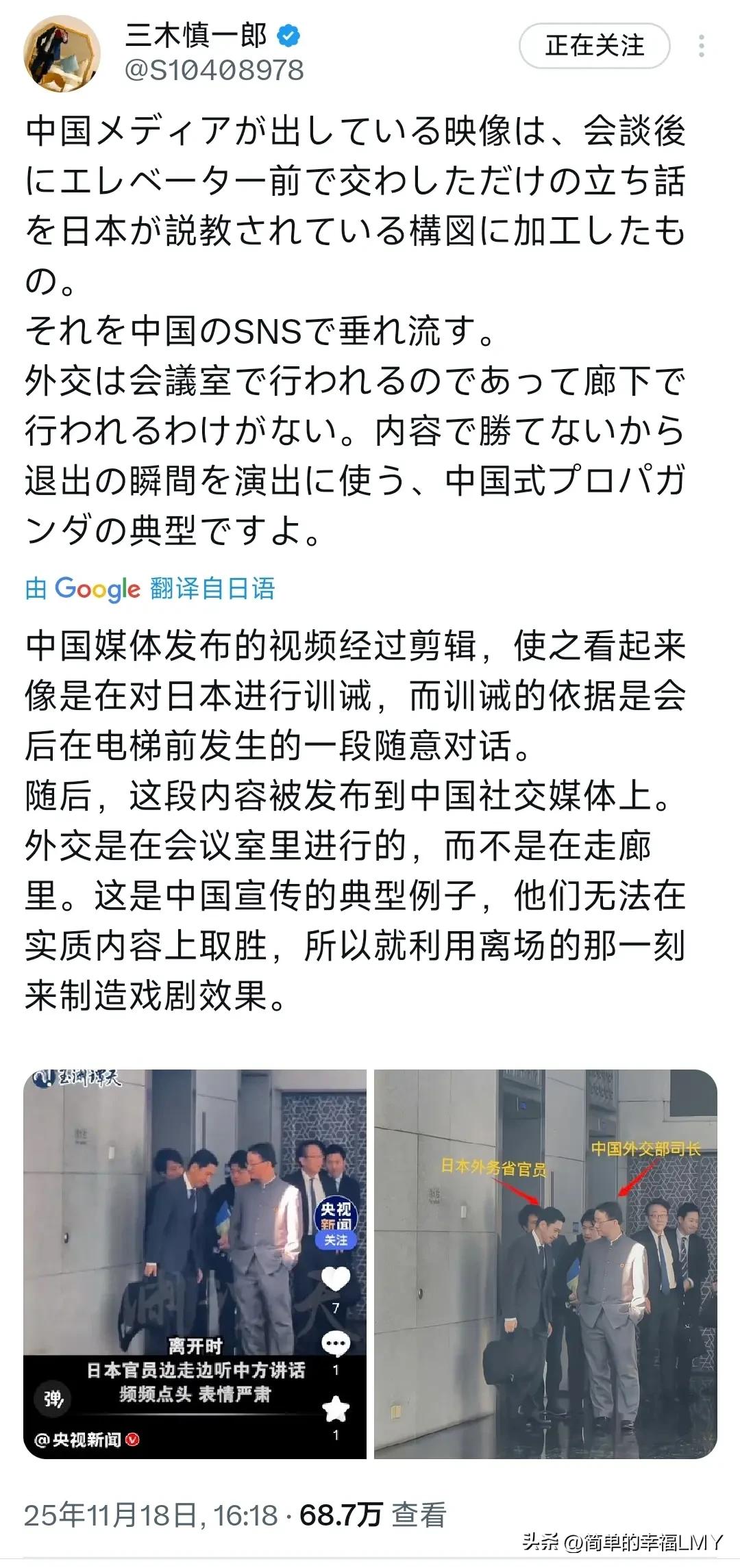 自尊心多强自卑心就有多强! 日本保守派人士、企业家三木慎一郎11月18日写道:“中国媒体发布的视频经过剪辑,使之看起来像是在对日本进行训诫,而训诫的依据是会后在电梯前发生的一段随意对话。 随后,这段内容被发布到中国社交媒体上。外交是在会议室里进行的,而不是在走廊里。这是中国宣传的典型例子,他们无法在实质内容上取胜,所以就利用离场的那一刻来制造戏剧效果。” 这个逻辑非常不正确。日本外务省主动派司局级官员来华解释,这是我们主动进行的“宣传”吗?要是当时日本官员不是站在那里低着头的话,或许镜头的角度就不会让日本人这么难受了。 日本保守派人士兼企业家三木慎一郎这番说辞看似振振有词,实则漏洞百出,不过是混淆视听的片面之词。现代外交早已摆脱单一会议室的局限,演变为多元场景的综合互动。 从领导人的非正式会面到官员间的临场沟通,从多边论坛的间隙交流到日常事务的即时对接,外交的触角延伸到每一个能传递立场、增进理解的场景。 认为外交只能发生在布置规整的会议室里,无疑是刻舟求剑的狭隘认知,完全无视了当代外交灵活多元的发展趋势。三木慎一郎刻意将外交场景固化,本质上是为了回避核心问题而设置的文字陷阱。 此次事件的前提本就清晰明了:是日本外务省主动派遣司局级官员来华解释,而非中方主动邀约。日方官员之所以出现在电梯前与中方沟通,根源在于日本首相高市早苗近期涉台的露骨挑衅言论。 公然将“台湾有事”与日本集体自卫权挂钩,这是1945年以来日本领导人首次在正式场合鼓吹武力介入台海问题,性质极其恶劣。中方接连用“奉示”召见、“迎头痛击”等罕见表述表达立场,足见事态的严重性。 在这样的背景下,日方主动派人来华沟通,本就是承担责任、缓和局势的应有之举,何来中方“主动宣传”之说?视频的传播不过是记录事实的正常行为,镜头从来不会说谎,只会客观呈现当下的状态。 如果日方官员在沟通时并非低头敛目、神态局促,而是坦坦荡荡、理直气壮,又怎会让旁观者产生“训诫”的观感?正所谓身正不怕影子斜,若日方的行为光明磊落、符合国际法和国际关系基本准则,若其言论没有触碰中方的核心利益红线,自然无需畏惧任何镜头的记录。 将正常的事实呈现曲解为“制造戏剧效果”,恰恰暴露了日方内心的底气不足。三木慎一郎的言论更像是一场转移焦点的障眼法。日本国内已有三位前首相公开警示高市早苗的错误行径,多位政要和民众也纷纷提出反对。 涉日消费股大幅下跌、三季度GDP负增长,这些都是日方错误决策引发的连锁反应。面对自身引发的一系列问题,三木慎一郎不反思日本为何会陷入如此境地,不督促日方纠正错误言论,反而倒打一耙指责中方,这种本末倒置的做法实在难以服众。 中方网民在其评论区贴出照片反问“是否也是剪辑结果”,看似简单的质疑,实则戳破了其双重标准的本质。既然三木慎一郎坚信“剪辑能扭曲事实”,为何不反思自己所见所闻是否也可能被刻意加工?在信息传播高度透明的今天,任何试图靠抹黑他人、回避自身问题的做法都注定徒劳。 外交的根基是相互尊重与坦诚相待,而非逃避责任与颠倒黑白。日方若真想改善中日关系,与其纠结于一段记录事实的视频,不如正视自身错误,撤回涉台的危险言论,停止触碰中国的核心利益。三木慎一郎的狭隘言论终究改变不了事实真相,也掩盖不了日方行为的不当本质。 事实永远是最好的通行证,镜头记录的不仅是一个瞬间的沟通场景,更是国家立场的鲜明表达。那些试图靠混淆视听、转移焦点来逃避责任的做法,只会让外界更清晰地看到其内心的怯懦与理亏。 外交从来不是单方面的自说自话,唯有正视问题、尊重底线,才能真正维护国家间的和平与稳定,这才是对两国人民根本利益的负责。日方低头,不是卑微,而是在“找中方的手”。中方双手插兜,不是倨傲,而是不想给你任何握手的机会。 这才是最客观的解释,其他解读都带着各种目的。东方文化里,所谓“握手言和”,日本派人过来,根本不是为了谈事,就想骗一张双方握手的照片,拿回来各种自说自说,陷中方于“自证”和“解释”的被动场景。小日子,上百年了,还是如此精于细节,同时疏于战略。