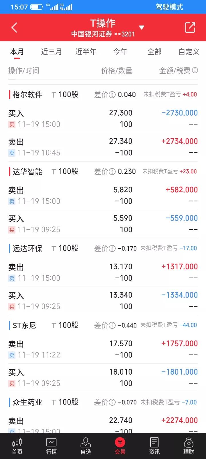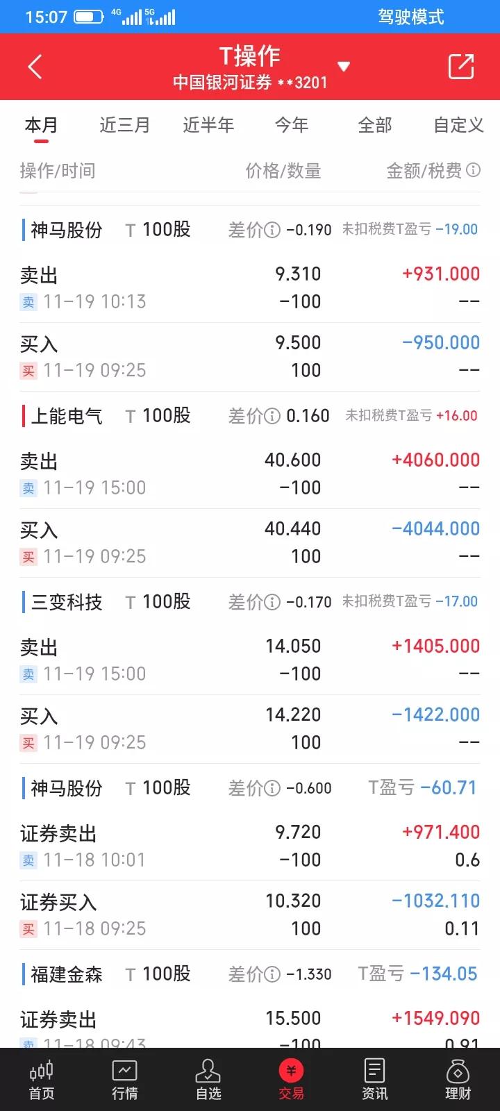 2025.11.19,今天做t又是失败的一天,t了2只etf,分别了500股和1000股,差价不大,赚8.5元,t了14只股票,亏了217元。