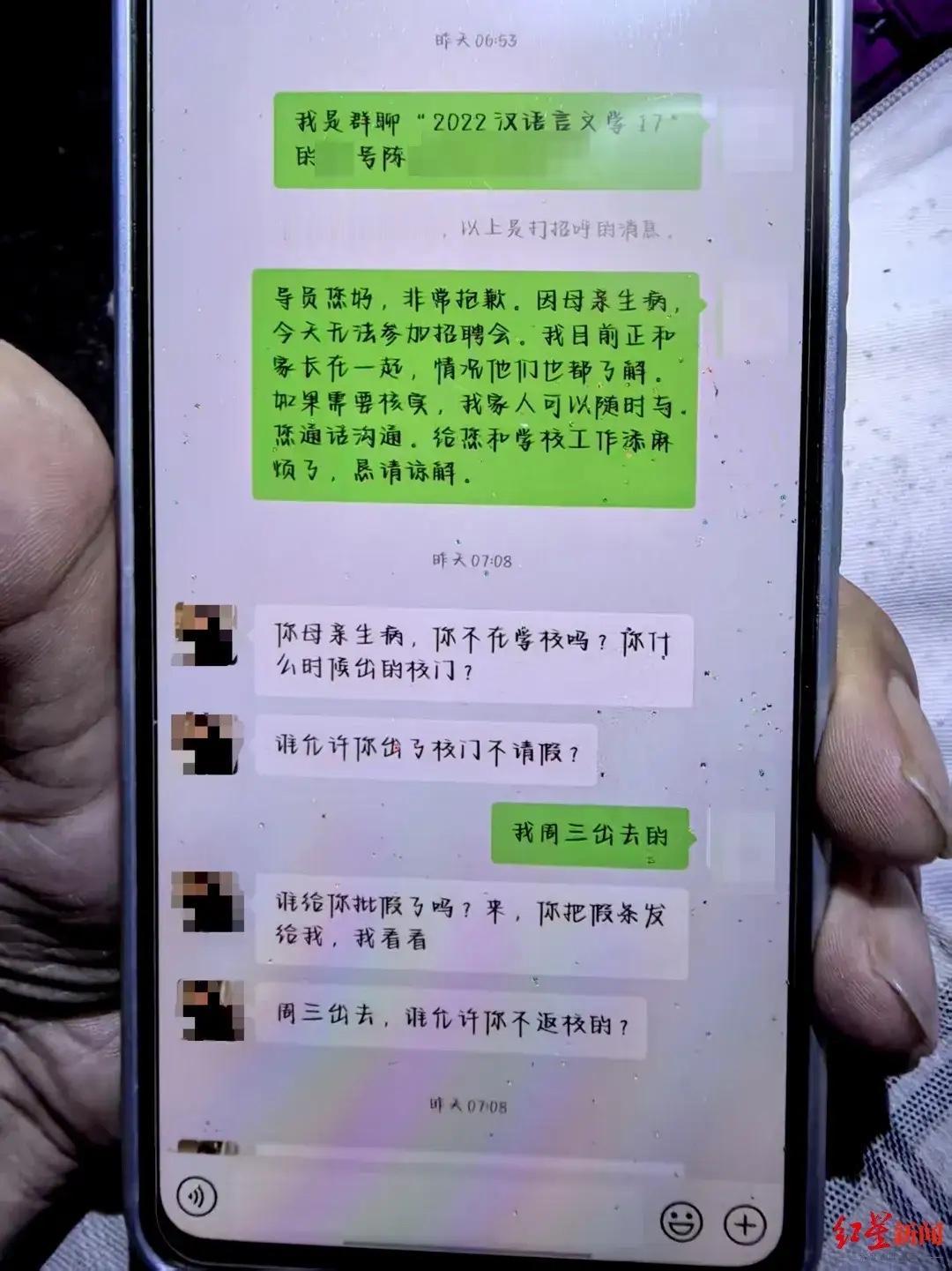 陕西安康,22岁大四女学生接到母亲生病的消息,她没办请假手续就急匆匆回家,并向导员发消息表达了歉意,导员得知后大发雷霆,让女生立马返校领处分,没想到,这句话成为压倒女生的最后稻草,她向导员发送一句:你真的很讨厌,跟妈妈告别后,女生就失联了,21天后,妈妈接到女生已跳河离世的噩耗。 2025年10月的一个清晨,22岁的陈某某从西安回到了老家安康。 她是个大四学生,眼看着就要毕业了,本该忙着找工作、准备答辩,然而,她却突然接到母亲生病的消息。 所以这次回家,她就是想看看生病的母亲。 根据她母亲许女士的说法,陈某某在电话里提起过要回家“说个事”,可真到了家,她又什么都没说出口。 陈女士没想到,女儿想说的话还没说出口,就出事了。 那天是10月15号,陈某某没向学校请假就直接离开了西安。她可能觉得母亲生病是急事,不用太较真。 可她忘了,大学有严格的规矩,尤其是大四学生,每次离校都得走正式流程。 早晨6点多,天刚蒙蒙亮,陈某某就给辅导员冉某某发了微信。 她打了一段话,语气很诚恳地说道:导员您好,真不好意思。我妈身体不舒服,我今天去不了招聘会,如果您需要核实,我家人随时能接电话。给您和学校添麻烦了,请多包涵。 导员冉某某回得很快,也很严厉,说谁让你不请假就私自出校门?谁同意你不返校的? 他命令陈某某立刻、马上返校,还说现在回来领处分,让你家长立刻给我打电话! 陈某某可能没想到老师这么强硬,她心里那股劲儿一下子泄了。 短短几小时后,到了10点32分,她又发了条微信给冉某某,写道:你真的好讨厌,我好不容易鼓起了勇气,你为什么要无情的打破? 此时的陈某某,明显是被老师的态度击垮了。 冉某某没停下追问。他回复说:你不请假就跑出去?这是我的错吗?还是我说错话了?你可以讨厌我,但必须遵守校规。快点把离校手续发来。 见陈某某没反应,他又补了几条:不管什么事,返校找我商量。你有问题可以请假,别偷偷跑出去。我没拦着你看你妈,但你私自外出,安全谁负责? 冉某某可能觉得自己是职责所在,生怕学生出事才强硬点。 可对陈某某来说,这成了压倒骆驼的最后一根稻草。她本就内向敏感,面临毕业压力,加上母亲的病,老师这一通连环炮,让她彻底崩溃了。 许女士得知消息后,马上给冉某某打了电话,证明孩子确实是因为她生病回来的。 然而与此同时,陈某某也给母亲发了最后一条消息。 她说:妈妈,对不起,我真的坚持不住了,请不要为我伤心,照顾好自己的身体,再见。 这段话让许女士意识到事情不妙,她急疯了,一遍遍打电话联系女儿,却再也接不通。 21天后,噩耗传来:陈某某的遗体在老家附近的河里被发现。 当地警方调查后确认,她是自杀身亡,排除了刑事案件的可能。 事发后,许女士一家去找女儿的学校讨说法。校方派了人专门来沟通,但态度让家属心寒。 学校方面坚持认为陈某某的自杀和校方无关,不过愿意给5万元当作人道主义补偿。 许女士一家对此无法接受,5万块钱,换不回一条鲜活的生命。他们觉得学校在推卸责任。女儿的死,难道和老师的严厉训斥没关系吗? 记者试图采访当事老师冉某某,他表示:学校和警方都问过话了,你们有问题直接找校领导吧,我现在不负责这事,没法多说。 再打给学校负责人蓝某,电话压根没人接。 这下更让家属难受了,学校连个正面回应都不给,好像这事轻飘飘就过去了。 回看整个事件,陈某某的内心深处,可能充满了迷茫和压力。大四了,就业难、论文紧,加上母亲生病,她偷偷回家是想喘口气。 老师冉某某呢?他或许真出于好心,担心学生安全、维护校纪,可他严厉的言辞和领处分的话语,无意中成了压垮女孩的最后一击。 那么,从法律角度,怎么看待这件事? 《民法典》第1199条至1201条规定:教育机构对在校学生负有教育、管理职责,需采取必要措施防止学生受到侵害。 陈某某作为大四学生,虽接近成年,但学校仍需履行安全保障义务,包括对学生离校行为的规范管理、心理健康关注。 辅导员冉某某在微信中要求“立即返校领处分”,并强调“安全谁负责”,也反映出学校对学生离校安全的管理要求。 那么,陈某某的自杀是否与学校行为存在法律上的因果关系? 冉某某的微信回复中,“立刻返校领处分”“谁允许你不返校”等表述,如果被认定为“过激训斥”或“言语施压”,可能构成对学生人格权的侵犯。 如果学校未建立有效的离校审批流程、未及时关注学生心理状态,则可能被认定存在管理疏忽。 不过,家属需证明学校存在过错,且该过错与自杀存在因果关系。学校则需证明已尽到合理管理职责。 如果家属起诉,法院将依据人身损害赔偿和精神损害赔偿判决。 对于这件事,你怎么看? 关注@运良说法. 学法律知识不迷路