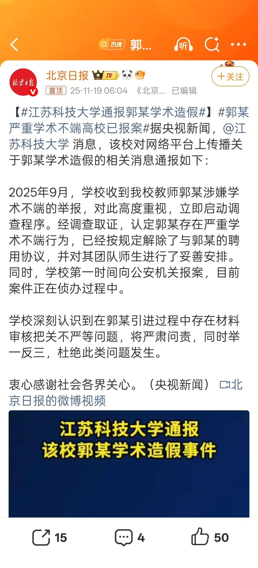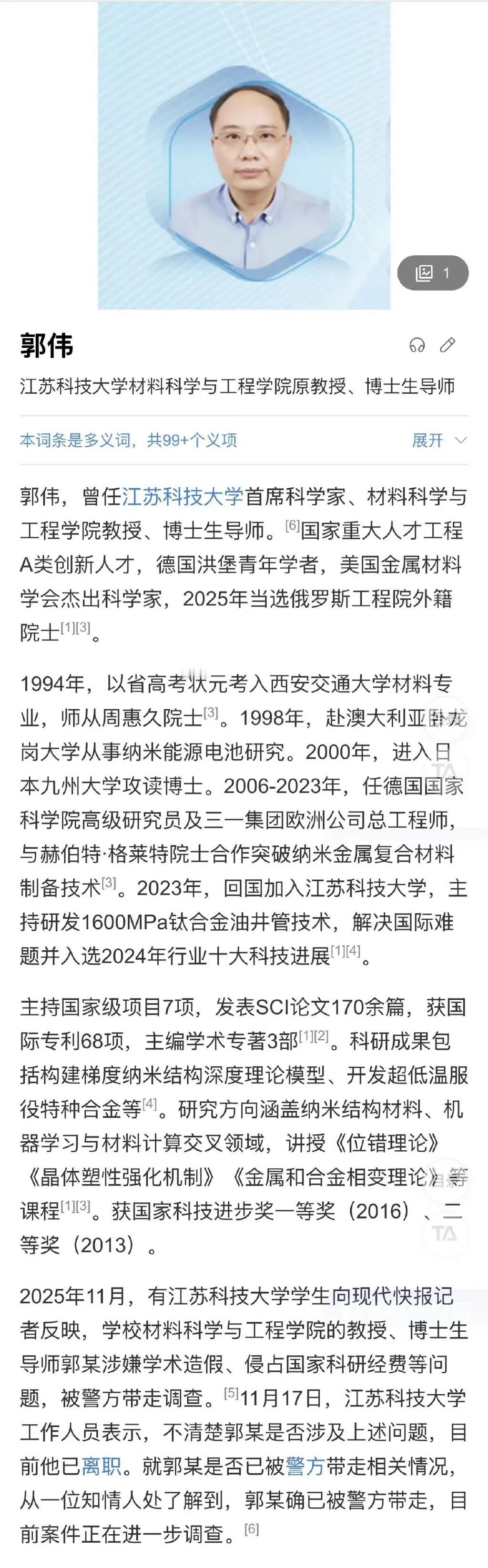 简直让人笑掉大牙! 高中生给大学生上课! 只有高中文化程度的郭伟,拿同名同姓的人的履历、论文冒充纳米材料研究专家,2023年被聘为江苏科技大学首席科学家、二级教授,招了博士。 他骗取上千万元经费,今年要参选院士,才东窗事发才被抓。