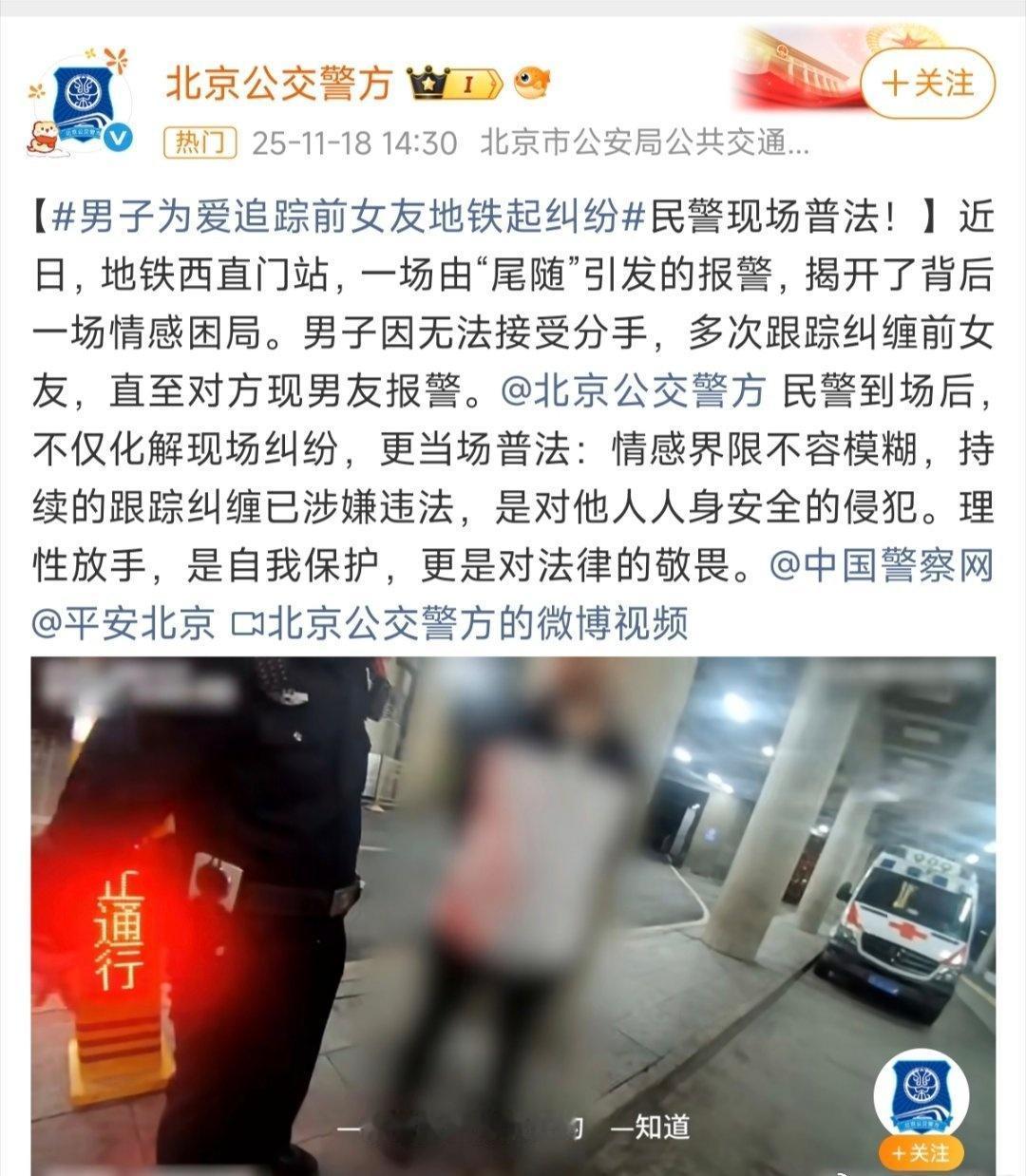 男子为爱追踪前女友地铁起纠纷持续的跟踪赳缠已涉嫌违法,是对他人人身安全的侵犯。假如遇到这种情况,应及时报警。北京[超话]