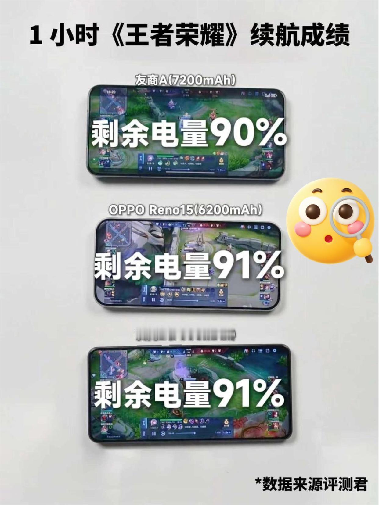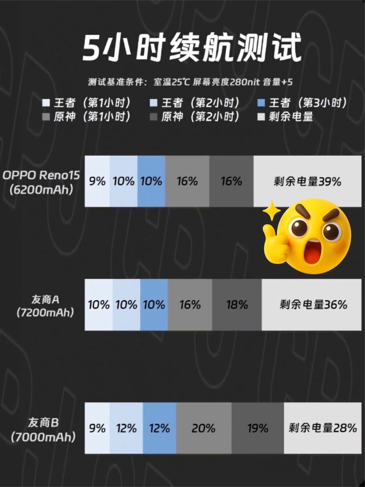 不是,Reno15续航这么强的嘛? 苹果:这事我熟,大电池≠长续航 怎么现在还有很多人被“大电池=长续航” 给CPU了... iPhone不就是活生生的例子吗? 电池不大但优化到位,续航也能打 但有些大电池机型,实际续航却一言难尽... 这点从博主测评君给的实测数据可以看出来, 虽然OPPO Reno15电池容量是6200mAh,但在5小时续航测试后还剩39%电, 测到关机一共坚持了9小时25分钟,比7200mAh电池的机型还要猛, 日常用一天完全不用慌~ 更别说这代Reno15影像提升也蛮大的, 除了给到了2亿像素主摄, 还有4K实况、前后同拍实况、出圈实况拼图这些超好用的功能玩法, 拍人、拍风景都很好出片。 而且主流游戏都支持超清游戏实况照片输出,简直是实况玩法天花板有木有~ 预算不高但又想有长续航+拍照好的,Reno15是不是可以看看? 数码大玩家 手机体验 OPPOReno15 手机续航 数码测评 手机续航测试
