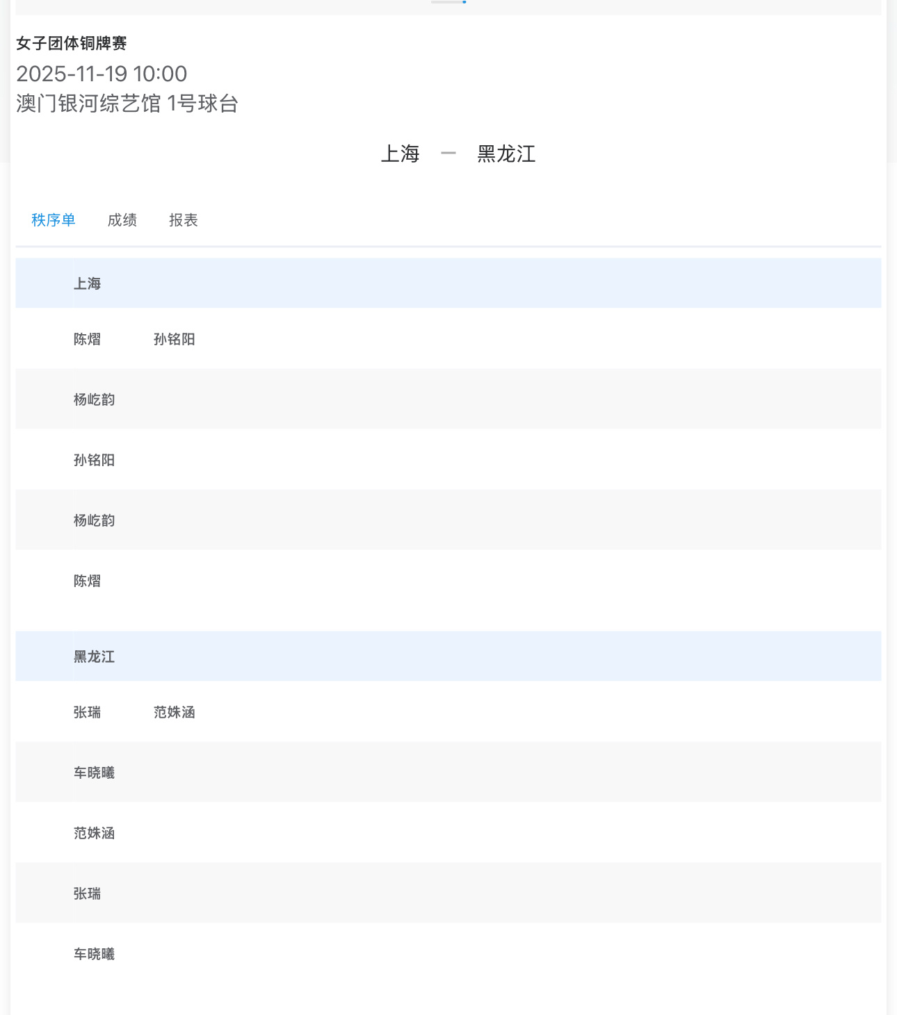 第十五届全运会乒乓球女子团体铜牌赛2025-11-19 10:00 1号球台【上海vs黑龙江】陈熠孙铭阳vs张瑞范姝涵杨屹韵vs车晓曦孙铭阳vs范姝涵杨屹韵vs张瑞陈熠vs车晓曦