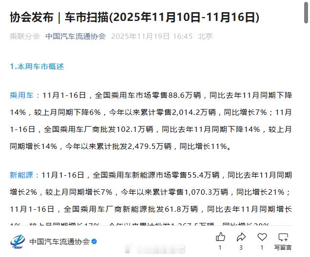 据乘联会数据统计发布,11月(1日-16日)全国乘用车新能源市场零售55.4万辆,同比去年11月同期增长2%,较上月同期增长7%,今年以来累计零售1,070.3万辆,同比增长21%;全国乘用车市场新能源零售渗透率62.5%;全国乘用车厂商新能源批发渗透率60.6%。