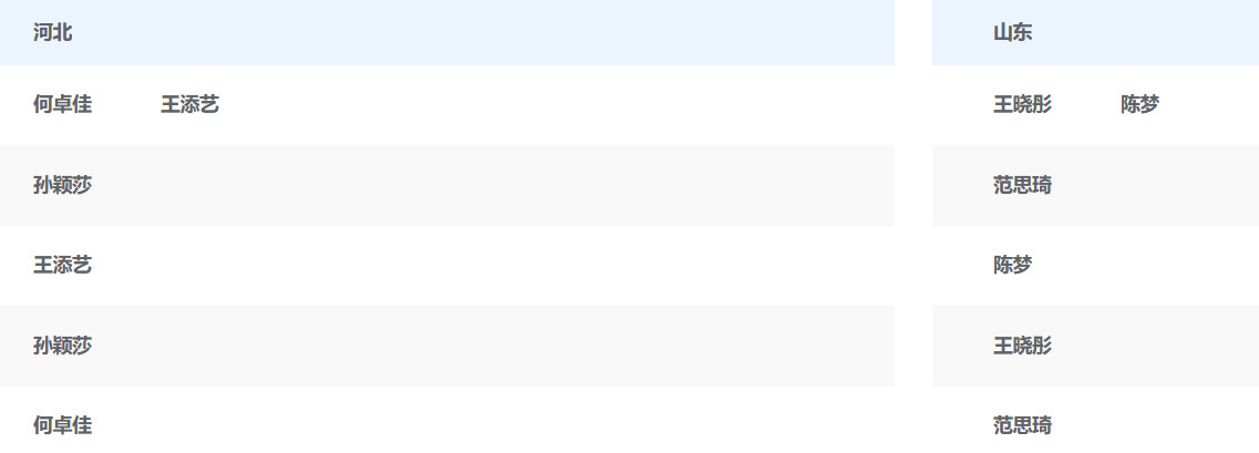 第十五届乒乓球女团决赛,河北队vs山东队出场阵容:第一场:何卓佳王添艺vs王晓彤陈梦第二场:孙颖莎vs范思琦第三场:王添艺vs陈梦第四场:孙颖莎vs王晓彤第五场:何卓佳vs范思琦 看两个队的排兵布阵,第一场双打很是关键!