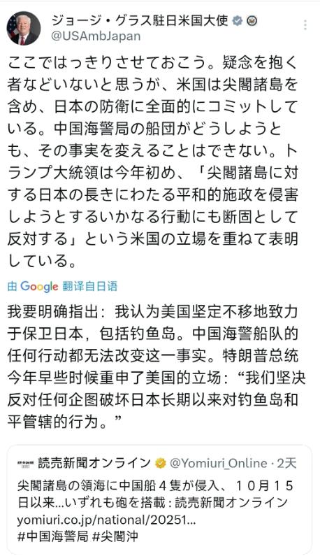 美国驻日本大使乔治·格拉斯发文:“我认为美国坚定不移地致力于保卫日本,包括钓鱼岛。中国海警船队的任何行动都无法改变这一事实。” 就算老美下场,那又怎样,别拿纸老虎皮当大旗,我们又不是没有与老美交过手,当年老美支持老蒋打内战,又怎样呢,在朝鲜战场上交锋,又怎样呢,正义总会战胜邪恶! 那就让日本有事呗,钓鱼岛是中国固有领土,中国必须要用实际行动捍卫属于中国领土的钓鱼岛,海警必须要每天至少有一次去钓鱼岛巡逻! 现在是新三国博弈,也许又有新的军国主义同盟,《开罗宣言》《波茨坦公告》在军国主义眼里就算个屁,废纸一张!中国人太善良了!太守规矩了!幸亏现在强大有实力,不然早又成为世界大战的主战场了