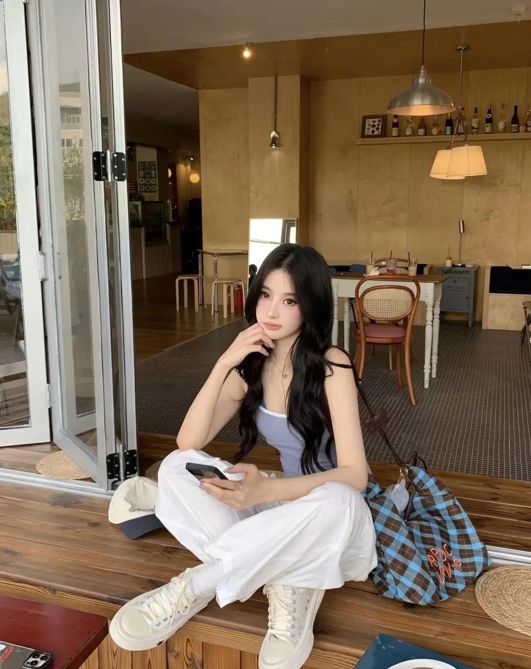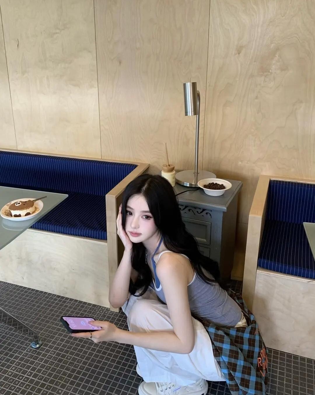 午后的咖啡馆露台,木质台阶晒得暖乎乎。浅紫吊带裹着松弛感,白裤晃着风的形状,手机