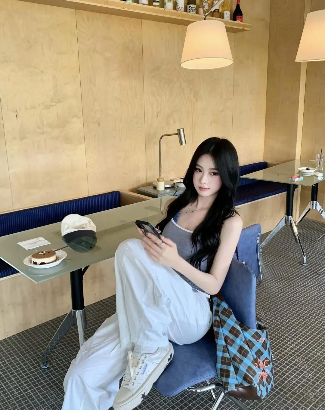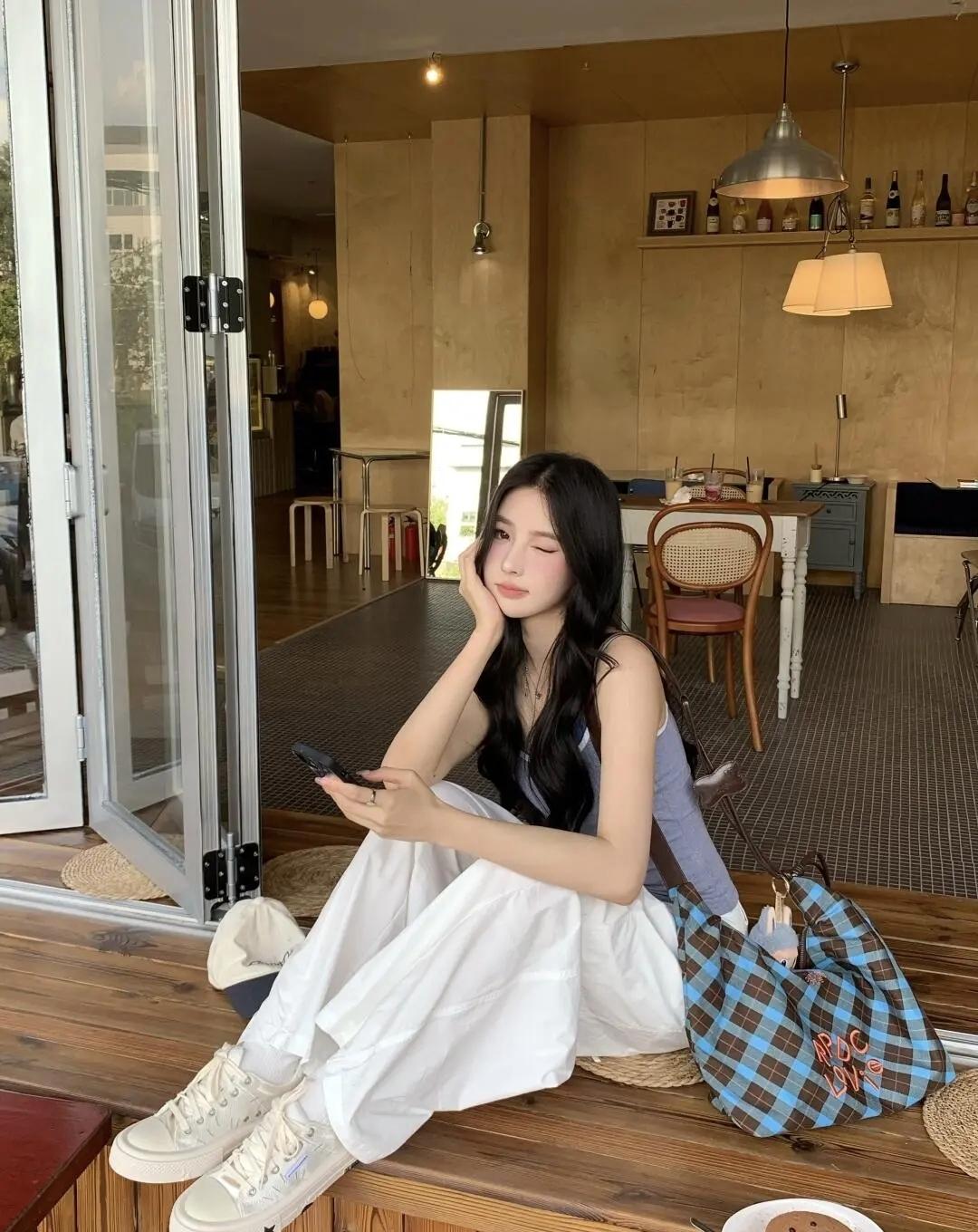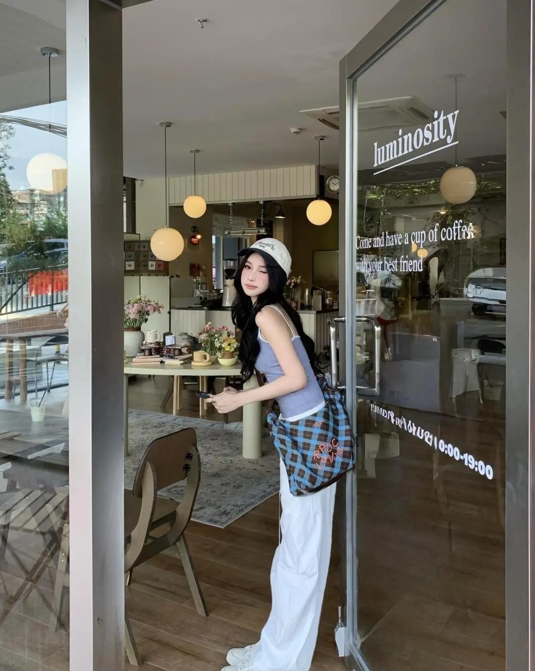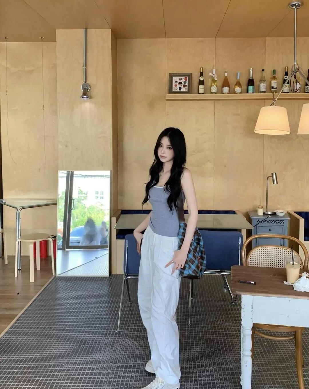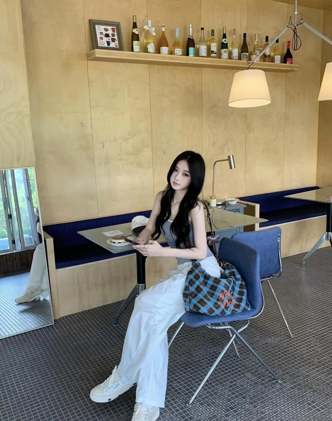 午后的咖啡馆露台,木质台阶晒得暖乎乎。浅紫吊带裹着松弛感,白裤晃着风的形状,手机亮着未读消息,格纹包懒在身侧——今天的节奏,是指尖碰得到的慢。