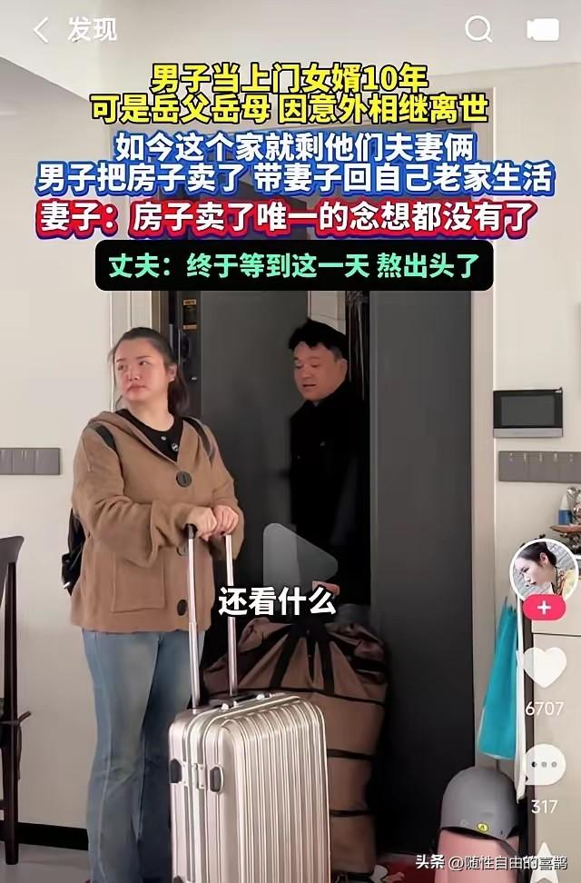 没有想到的事! 男子当了10年上门女婿,卖掉岳父母的房子带老婆回老家,临走时老婆流泪,男子却催着“赶紧走”,态度很冷淡。 网友:急着和岳父母的关系撇清?不至于吧,结婚10年了,难道心里没点儿感情?更何况,卖了房子可不代表就没有了。 房子是老婆对父母的念想,是她在这边的退路,是她在这边的依靠,现在卖了,万一俩人感情出问题了,她连个落脚的地方都没有。 麻烦看官老爷们右上角点击一下“关注”,既方便您进行讨论和分享,又能给您带来不一样的参与感,感谢您的支持!