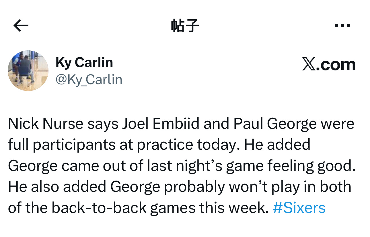 主教练尼克·纳斯今日接受采访表示,乔尔·恩比德和保罗·乔治今天都参与了球队全部集训内容。并补充道,乔治昨天比赛后感觉良好。另外表示,保罗·乔治有可能不会参加本周的两场背靠背比赛。