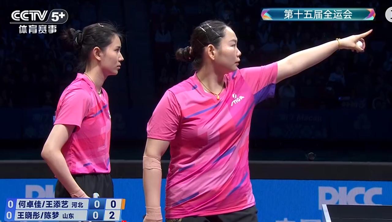 何卓佳怎么了?手指看台,难道是有人开闪光灯了。 第一盘双打 山东队派出的是王晓彤/陈梦, 河北派出何卓佳/王添艺 今天大梦状态不好, 一个接球失误, 一个发球失误, 王晓彤发挥不错, 山东4:2领先。 大梦落点好, 王晓彤正手扣杀, 山东两个正手配合不错。 这一局打的非常精彩, 有很多多拍相持, 山东11:8先下一局。