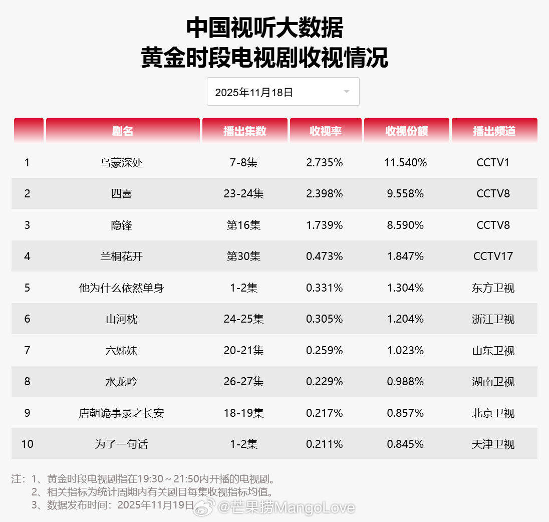 【2025年11月18日中国视听大数据CVB黄金档电视剧收视率日榜TOP10】1 乌蒙深处 CCTV12 四喜 CCTV83 隐锋 CCTV84 兰桐花开 CCTV175 他为什么依然单身 东方卫视6 山河枕 浙江卫视7 六姊妹 山东卫视8 水龙吟 湖南卫视9 唐朝诡事录之长安 北京卫视10 为了一句话 天津卫视