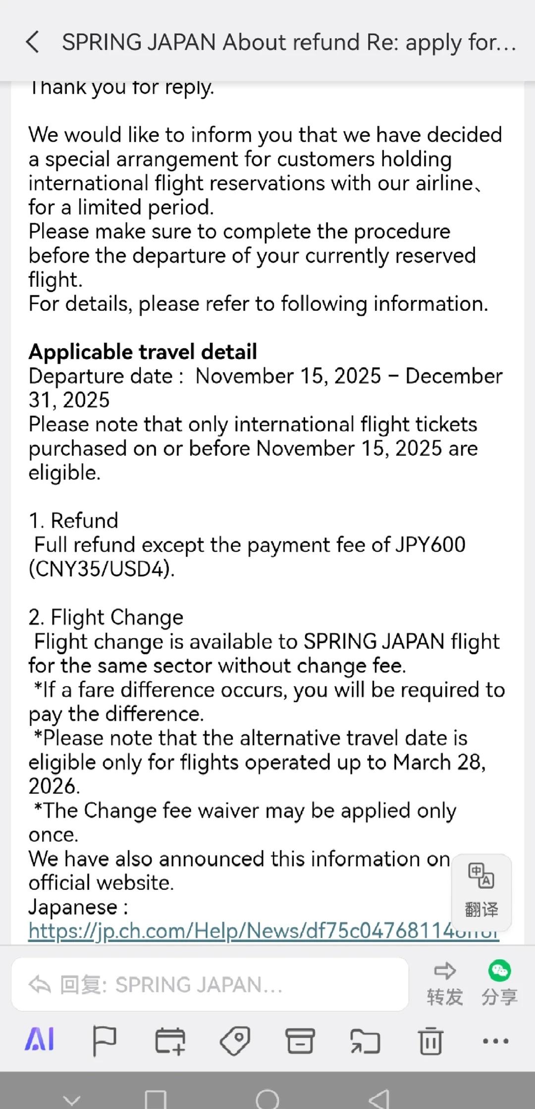 日本春秋回复我可以退票啦 前两天发邮件jpspringairlines,今天收到