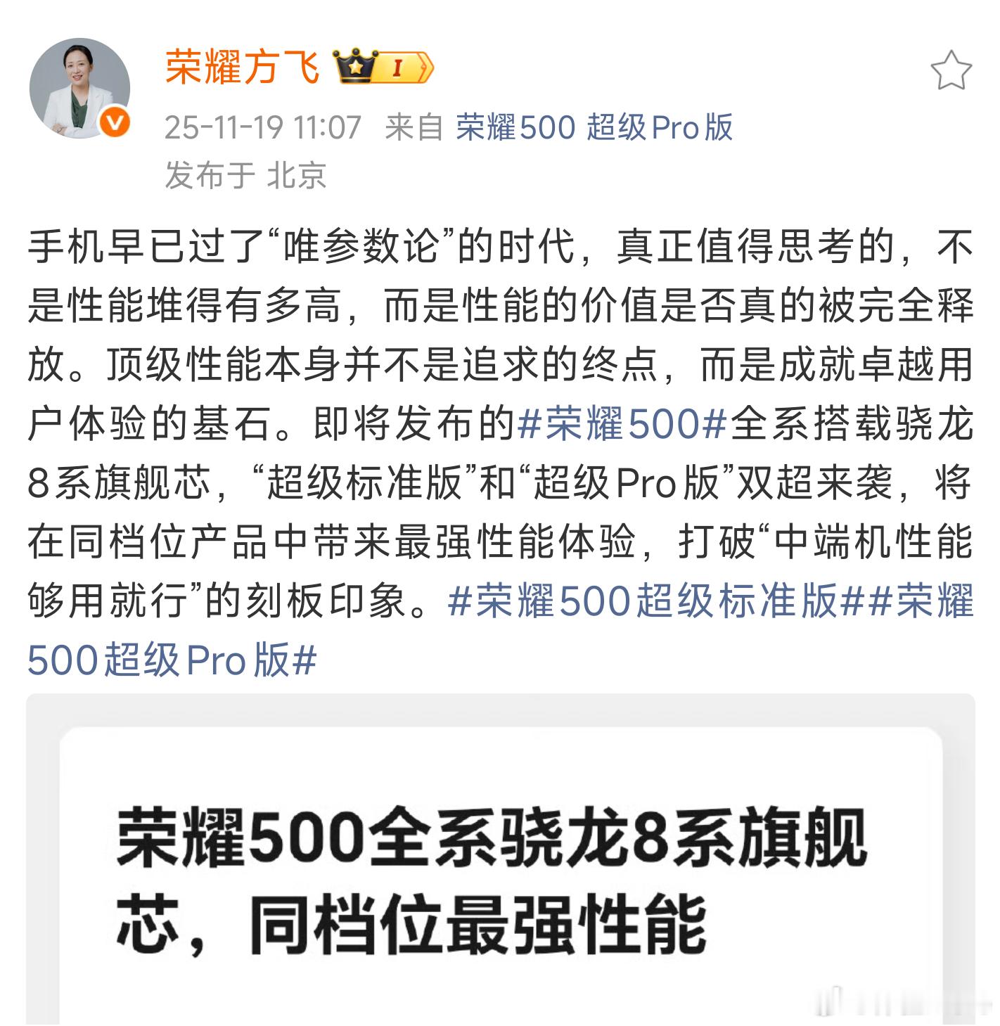 你要是问我,那肯定是不该妥协。处理器性能是手机体验的基础,大家都喜欢性能更好、能效更高的处理器。荣耀500系列全系搭载骁龙8系旗舰芯片,其中荣耀500搭载骁龙8s Gen4,荣耀500 Pro搭载骁龙8 Elite,都是同档最强性能,打破潮流轻薄旗舰性能差的刻板印象。把性能堆高是一方面,把性能体验做好是另一方面。荣耀500系列搭载最新的荣耀幻影引擎3.0,做到不卡顿、不掉帧、不烫手。配上同档领先8000mAh超大电池,让你畅玩手游大作一整天。解决用户需求,不吝啬性能和堆料,这就是荣耀打造荣耀500系列的理念。