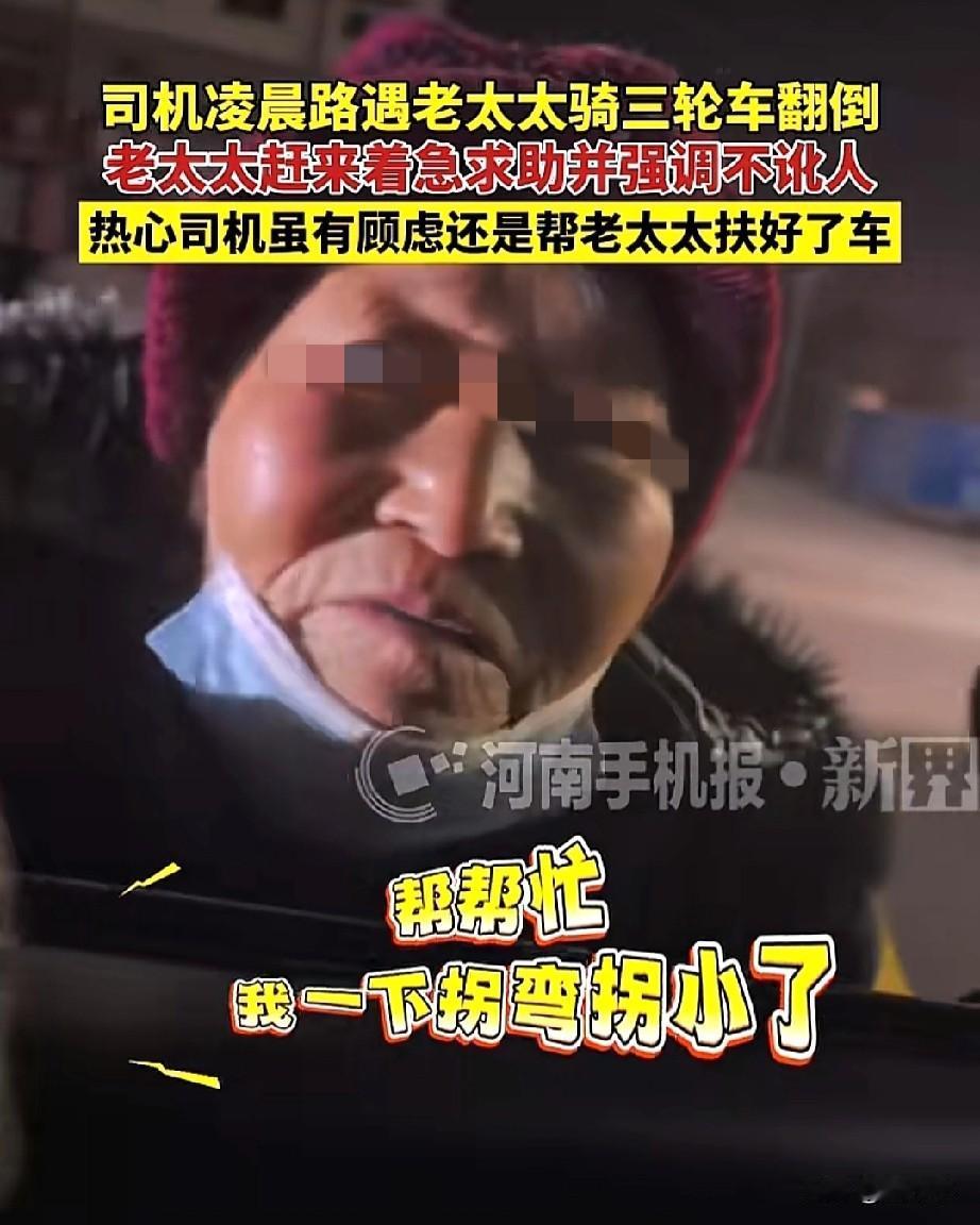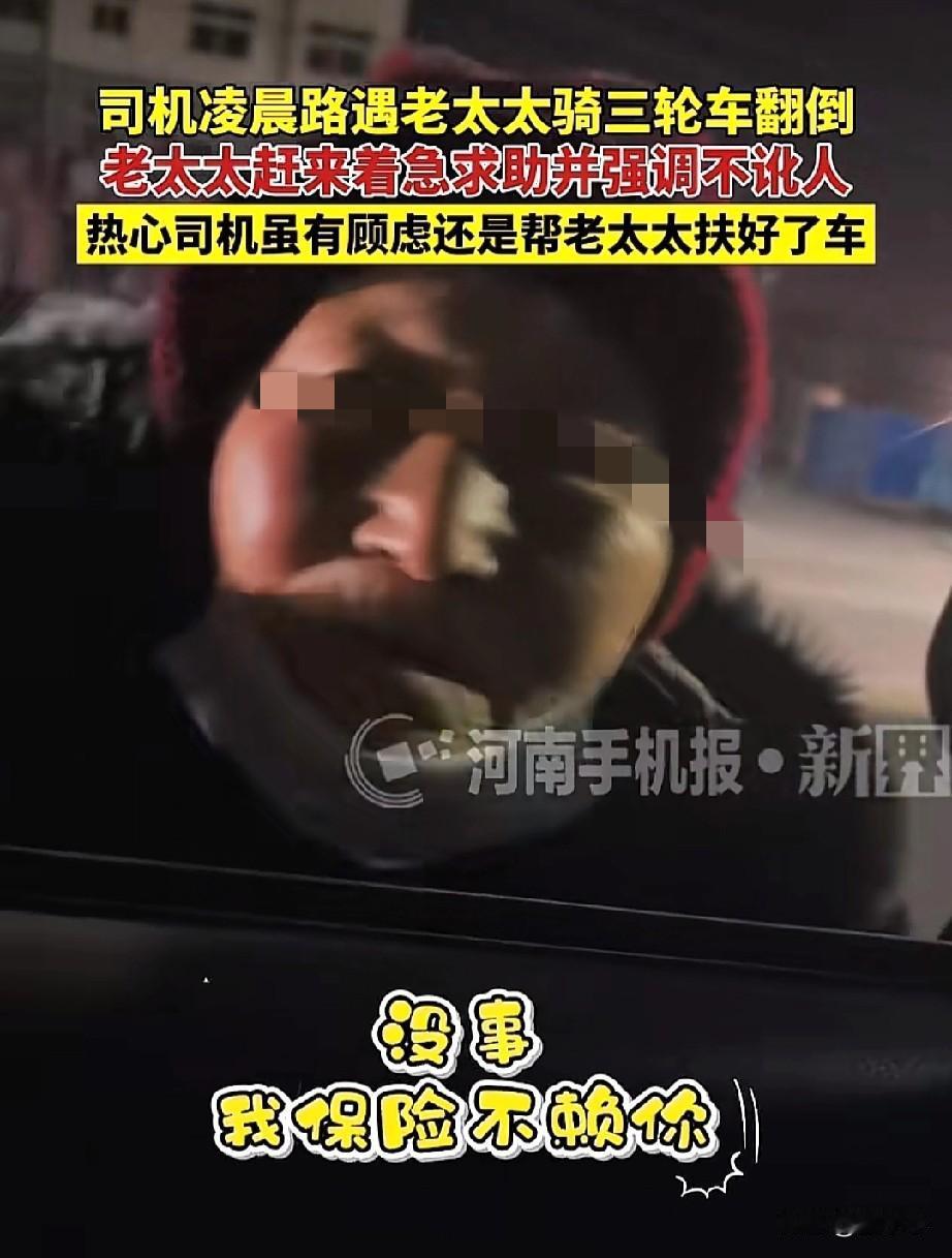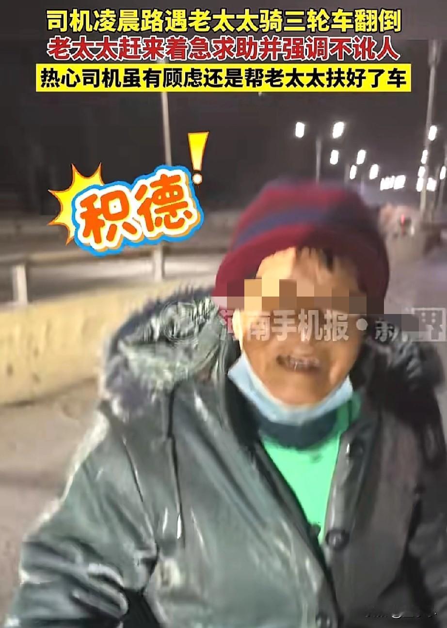 以前做坏事 心惊胆战…… 现在做好事 心惊胆战…… 山东德州,张先生凌晨5点时,遇到了一位老奶求助,原来,老奶奶骑着三轮车在拐弯的时候,拐小了导致了车子翻了,这个时候张先生正好经过这里。 对于,张先生的到来,这让老奶奶看到了曙光,连忙奔跑过去向张先生求助,希望能帮帮自己把三轮车扶起来。 张先生很怕自己会被赖上,并没有立马就答应下来,老奶奶也知道张先生的顾虑,一直向张先生保证,不会赖着你的。 也是因为老奶奶的这句话,张先生直接下车去帮忙,车子还没有扶起来,老奶奶就要拿着点吃的给张先生。 张先生一边和老奶奶说话,也一边用手机记录下来,毕竟防人之心不可无,不怕一万,就怕万一,好在车子扶起来后,老奶奶千谢万谢说道,做好事,积德! 说实话,不是我们没有热心肠,也不是我们不想做好事,只是我们真的害怕了。 不能让好人心寒,也希望这个视频能传到各省,这才是这个社会该有的样子。