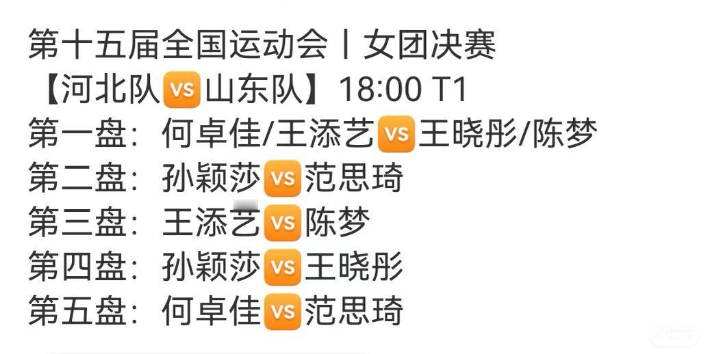 全运会女团决赛 孙颖莎一单3:1范思琦为河北队扳平大比分 11月19日,全运会乒乓球女团决赛 河北女团VS山东女团 第一盘 何卓佳/王添艺0:3陈梦/王晓彤 8:11,7:11,5:11 第二盘孙颖莎3:1范思琦 11:5,11:9,10:12,11:5 山东女团的排兵布阵是田忌赛马, 一人胜一盘, 最后就看何卓佳和范思琦的较量, 范思琦要是拿出打曼昱的状态, 山东队夺冠的几率很大啊! 孙颖莎今天的发挥很出色, 明显感觉到莎莎今天在收着打, 没有很快提速, 范思琦今天被莎莎压制, 技战术基本没有发挥出来, 河北队1:1战平山东队 加油孙颖莎, 加油山东队, 加油河北队!