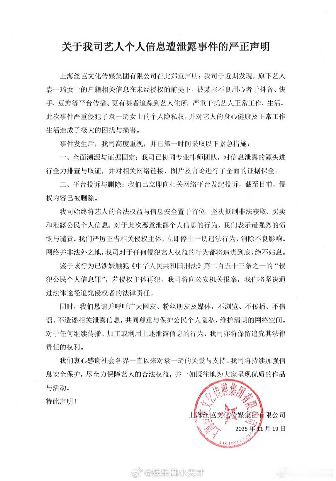 丝芭传媒和袁一琦工作室发布严正声明抵制个人信息泄露行为,并表示对侵权行为追责到底