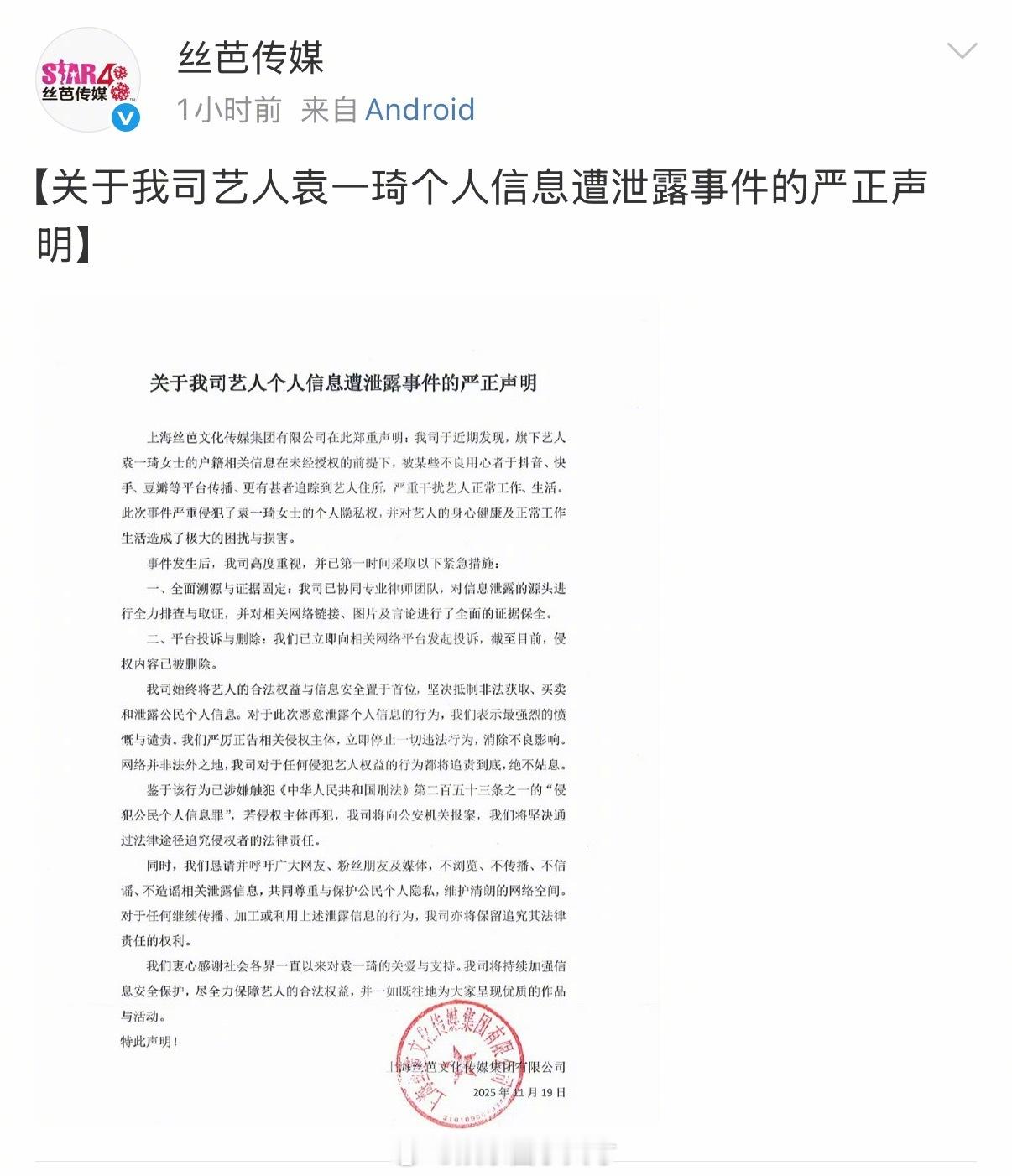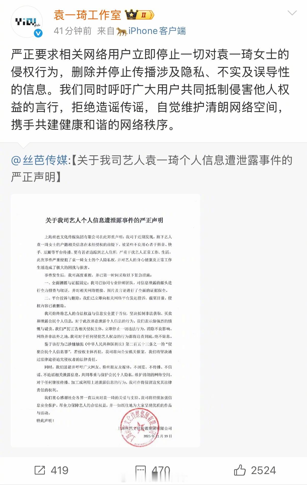 丝芭传媒和袁一琦工作室发布严正声明抵制个人信息泄露行为,并表示对侵权行为追责到底。