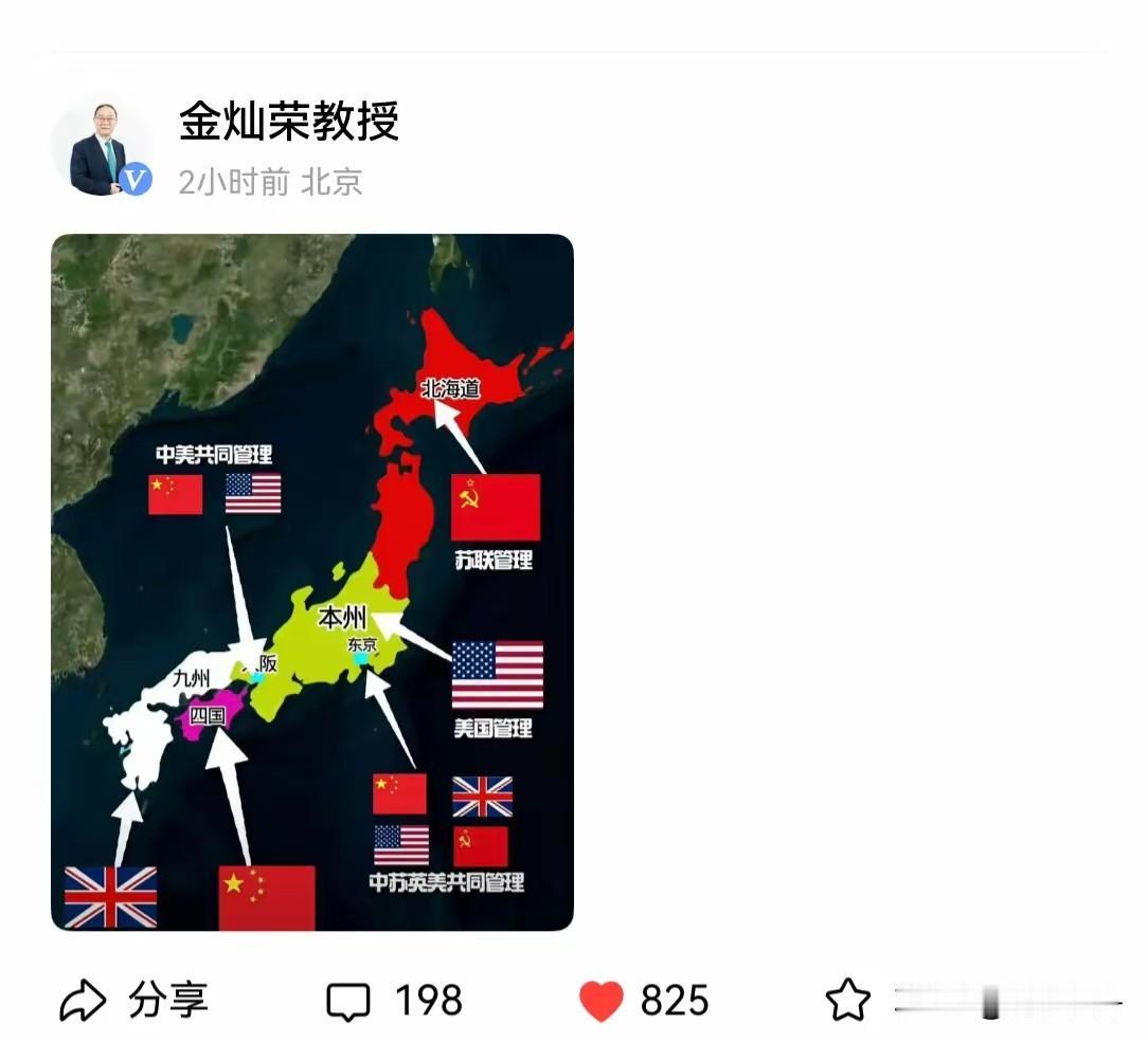 金灿荣教授刚发了一张波斯坦公告中苏美英四国分占日本示意图,虽然因种种原因最后没有落实,但是这都是白纸黑字写在公告中的,日本作为战败国理应严守战败国本份造福本国百姓,可是在美纵容下逐步脱绑妄图改变战败国地位变更军事发展策略,更意图重蹈二战复辙干预他国内政,只怕这次投降的机会都不会有了。 日本中央区 盟军占领日本 日本北方领土 日本版图演变 日本四岛分治 美日韩军事同盟 美日韩同盟