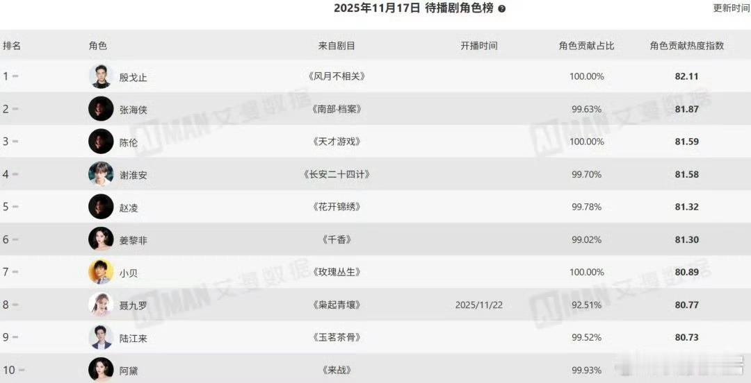 待播剧角色榜:邓为风月不相关殷戈止连续登顶!角色贡献占比100%,青年演员邓为未