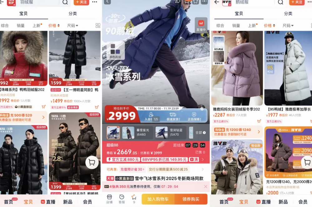 与此同时,雪中飞、雅鹿、鸭鸭等传统高性价比品牌,也纷纷推出了售价在1000元乃至2000元以上的产品线。值得注意的是,部分定位千元级别的款式,其填充物仍以鸭绒为主,这在数年前是无法想象的,彼时消费者普遍认为,千元价位应对应品质更高的鹅绒填充,鸭绒产品若定价过高则毫无“性价比”可言。