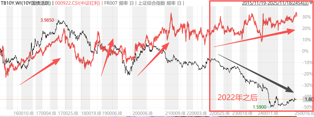 从2022年这个情况变了,市场利率快速走低,红利指数反而逐渐走高了。