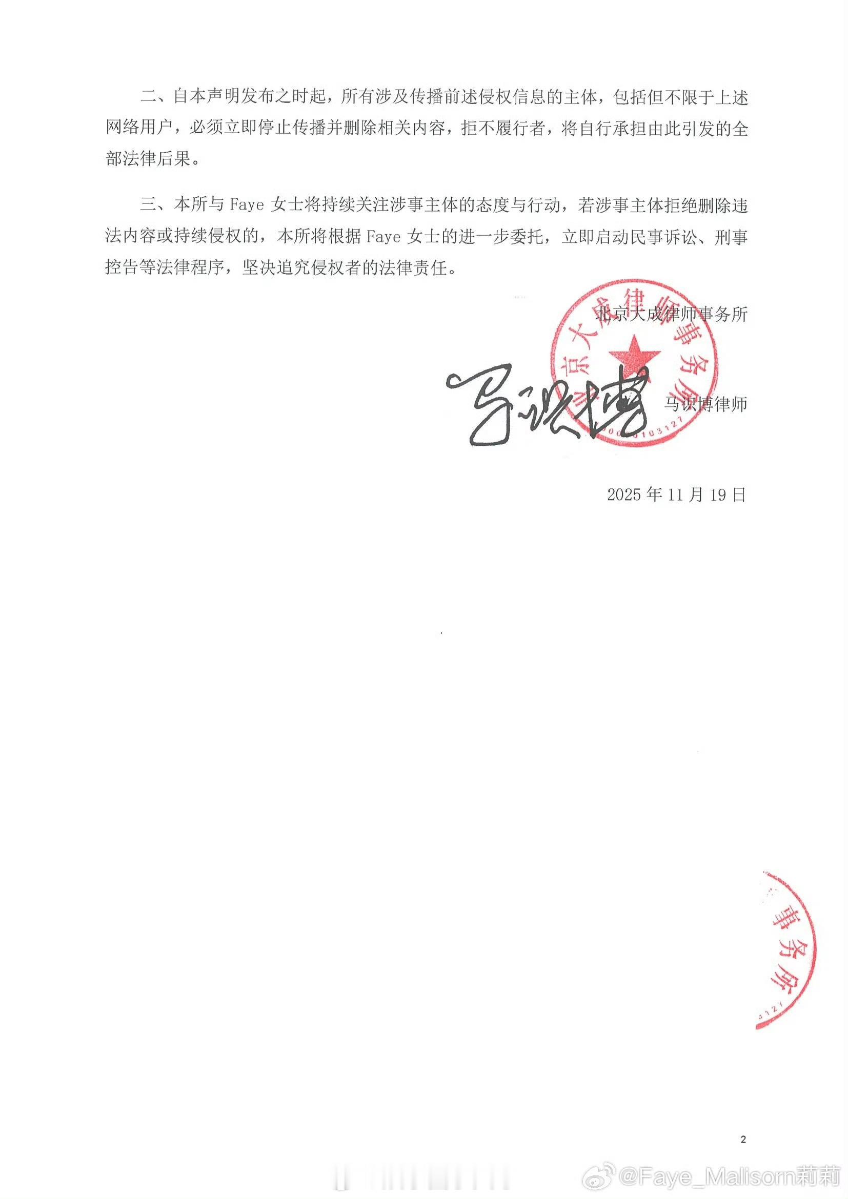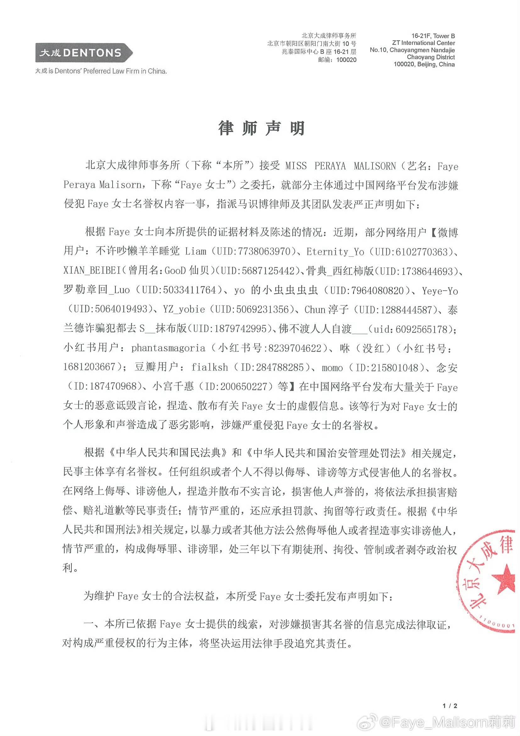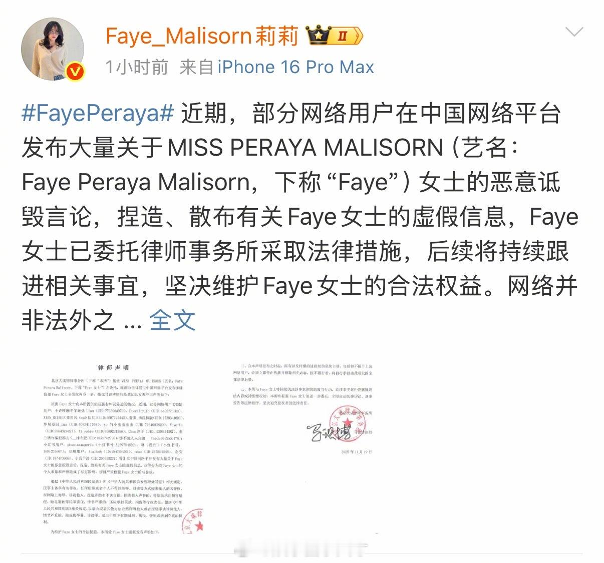 泰娱艺人fayeperaya发文委托北京某律师所告黑。