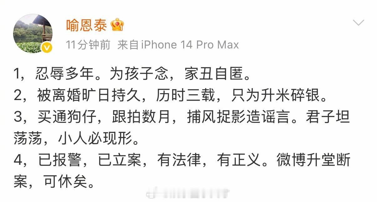 微博断更5年的喻恩泰,发文回应离婚风波。