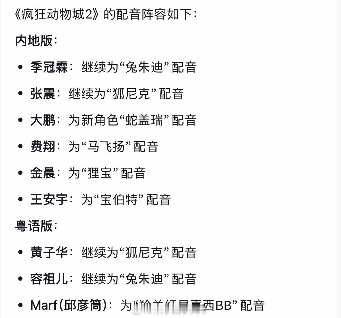 金晨、王安宇、费翔、大鹏等人为《疯狂动物城2》配音引热议。有观众认为专业的事应该留给专业的人来做,你怎么认为?这个配音阵容听上去还行吗?