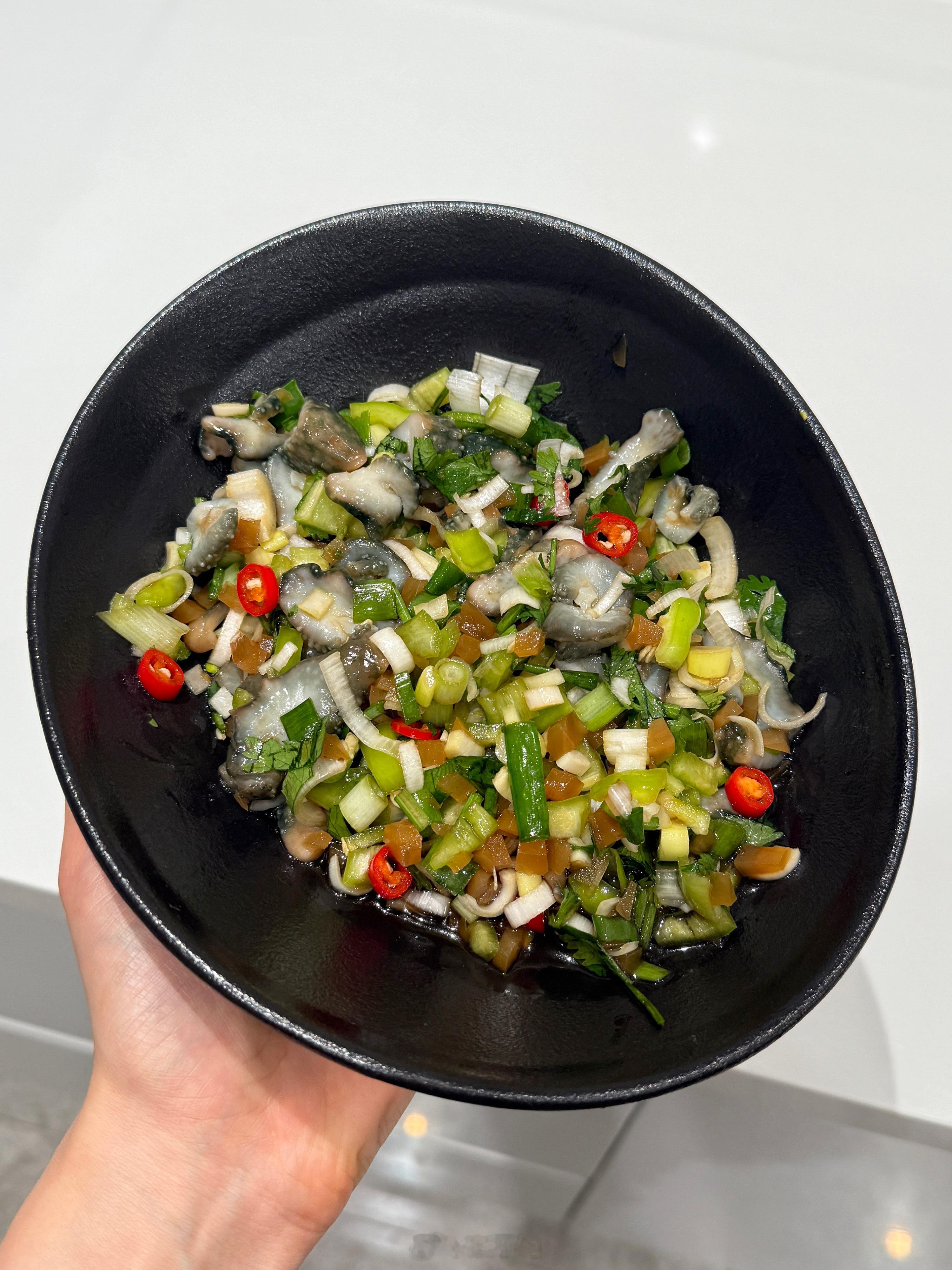 貂哥要求的老虎菜拌海参,不愧是青岛小哥