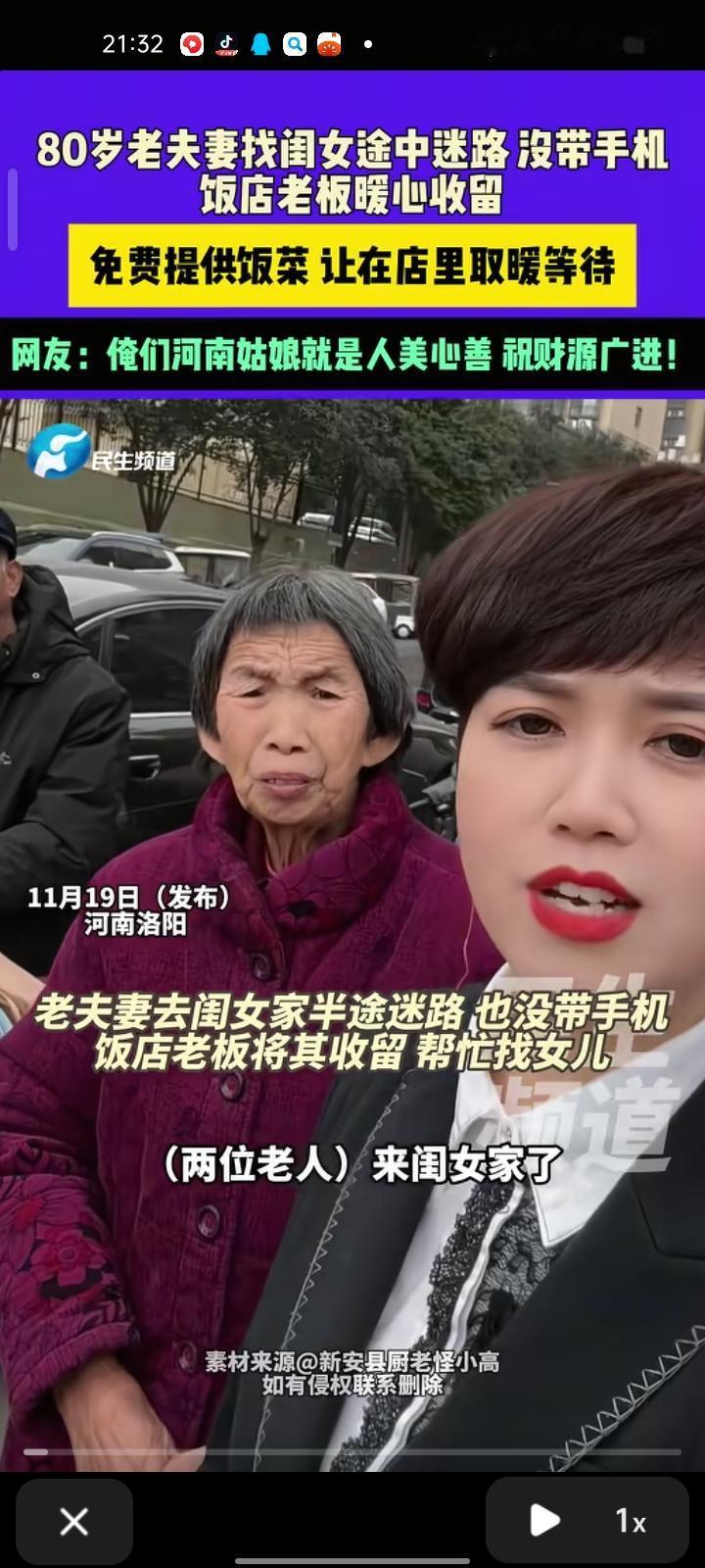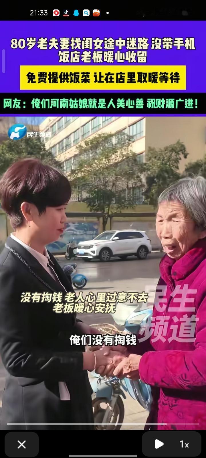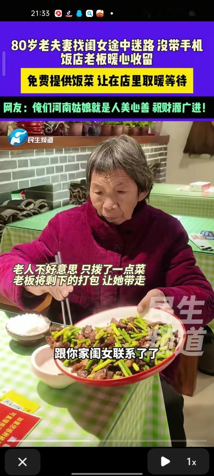 11月15日,洛阳市新安县。八旬老夫妻去闺女家半途迷路,也没带手机,饭店老板暖心收留,为他们免费提供饭菜,让他们在店里等待。老太太觉得饭菜太多,给他们吃浪费了,就拨了一点菜到碗里,老板将剩下的打包让她带走。 老夫妻吃完饭后,老板联系了家人,家人随后赶来了。没有掏钱,老人心里过意不去,老板暖心安抚。最后,老夫妻道谢完后就骑着三轮车走了